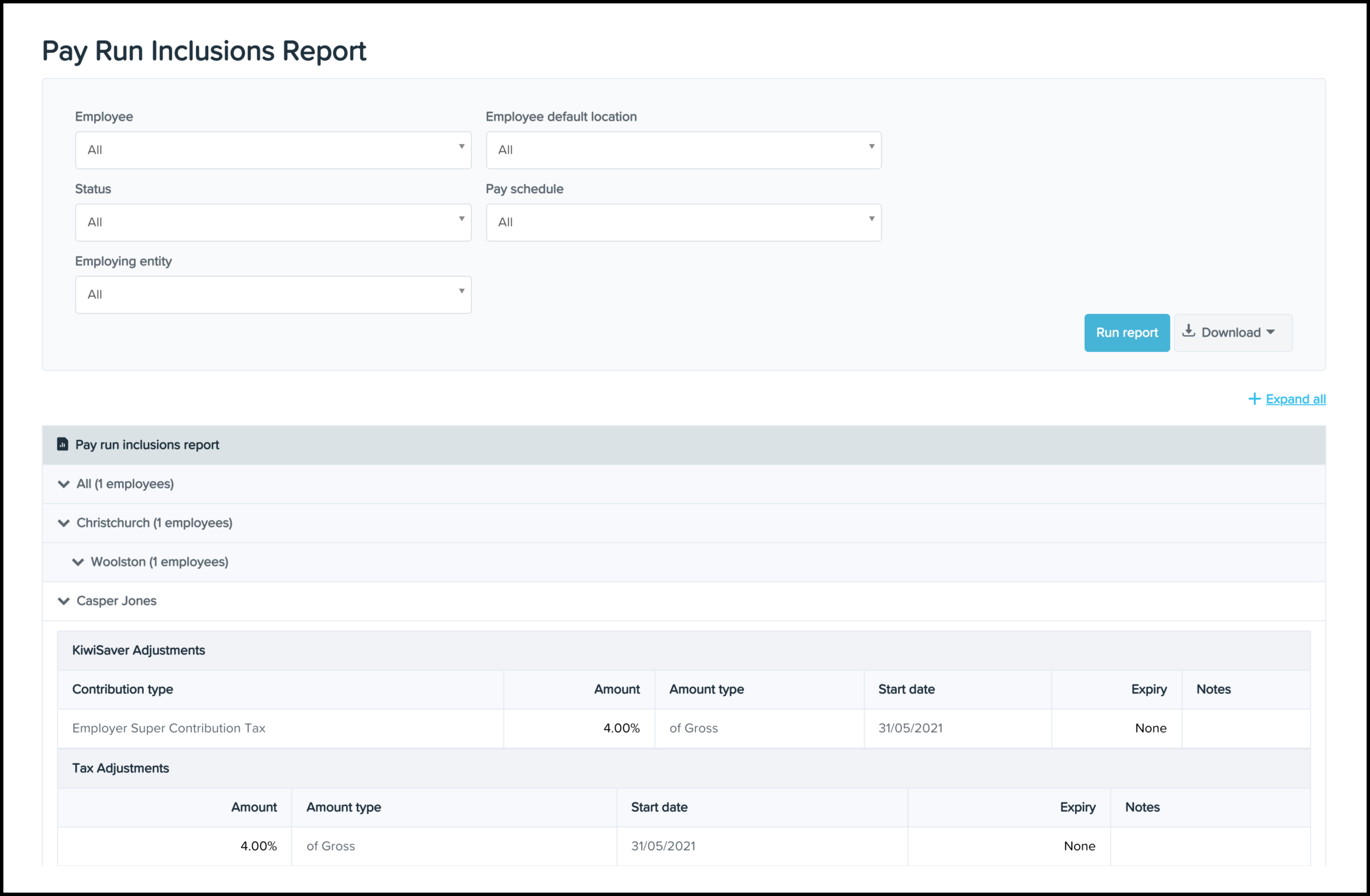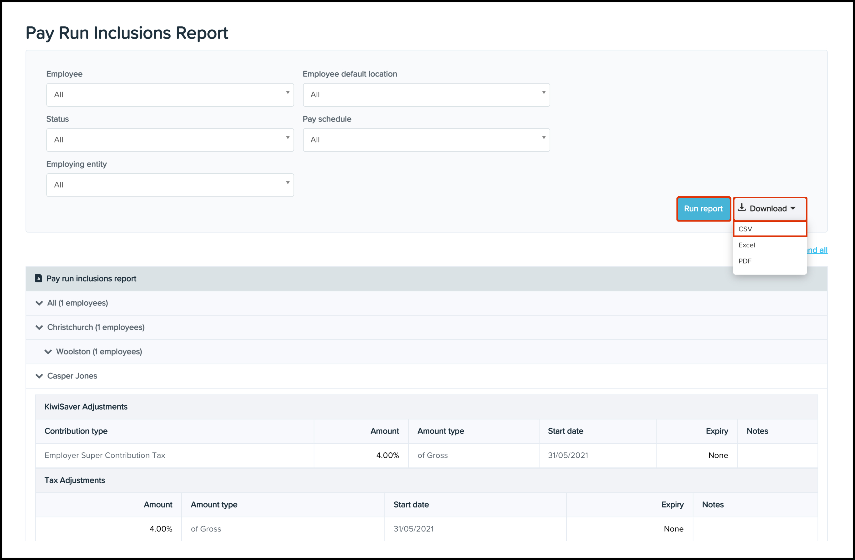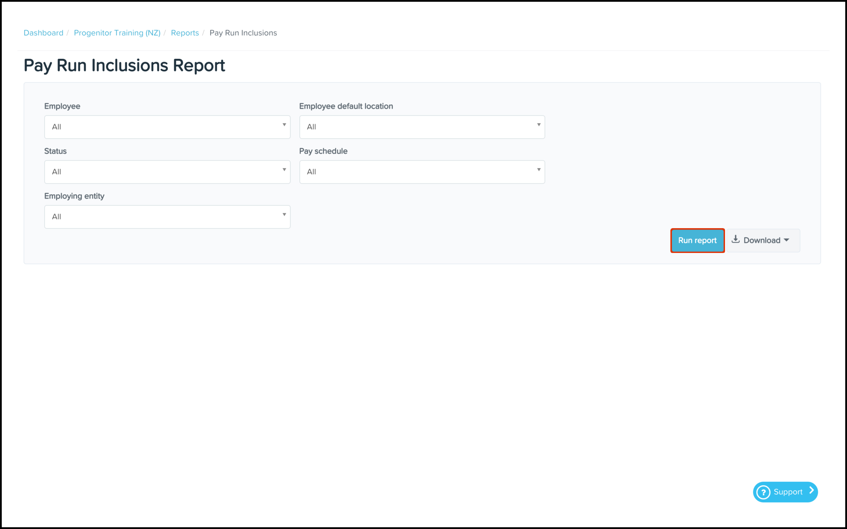 The Pay Run Inclusions Reporting feature allows you to create a report on the inclusions your organisation has processed within your finalised pay runs, with the ability to narrow this data down by status, pay schedule, and location. You can also use this feature to download an excel file of this data or save the information in a printable PDF format.