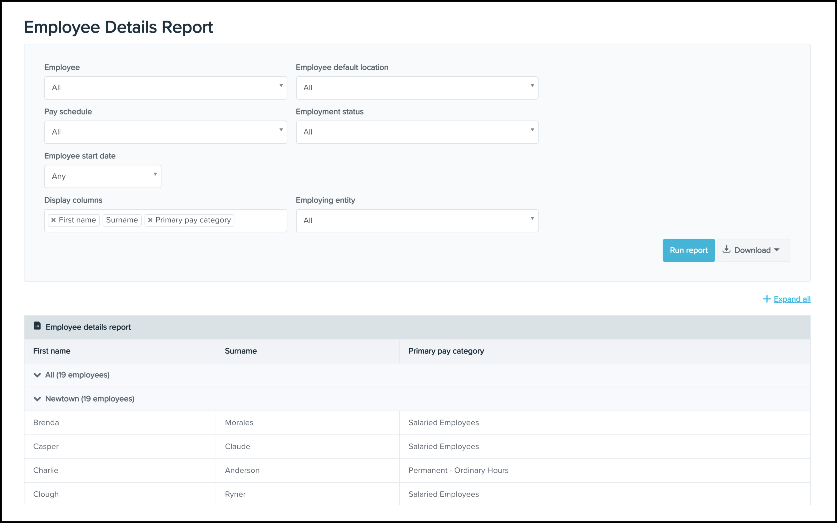 You can use the Employee Details Reporting feature to construct a report on the primary pay categories assigned to your employees within your payroll platform.