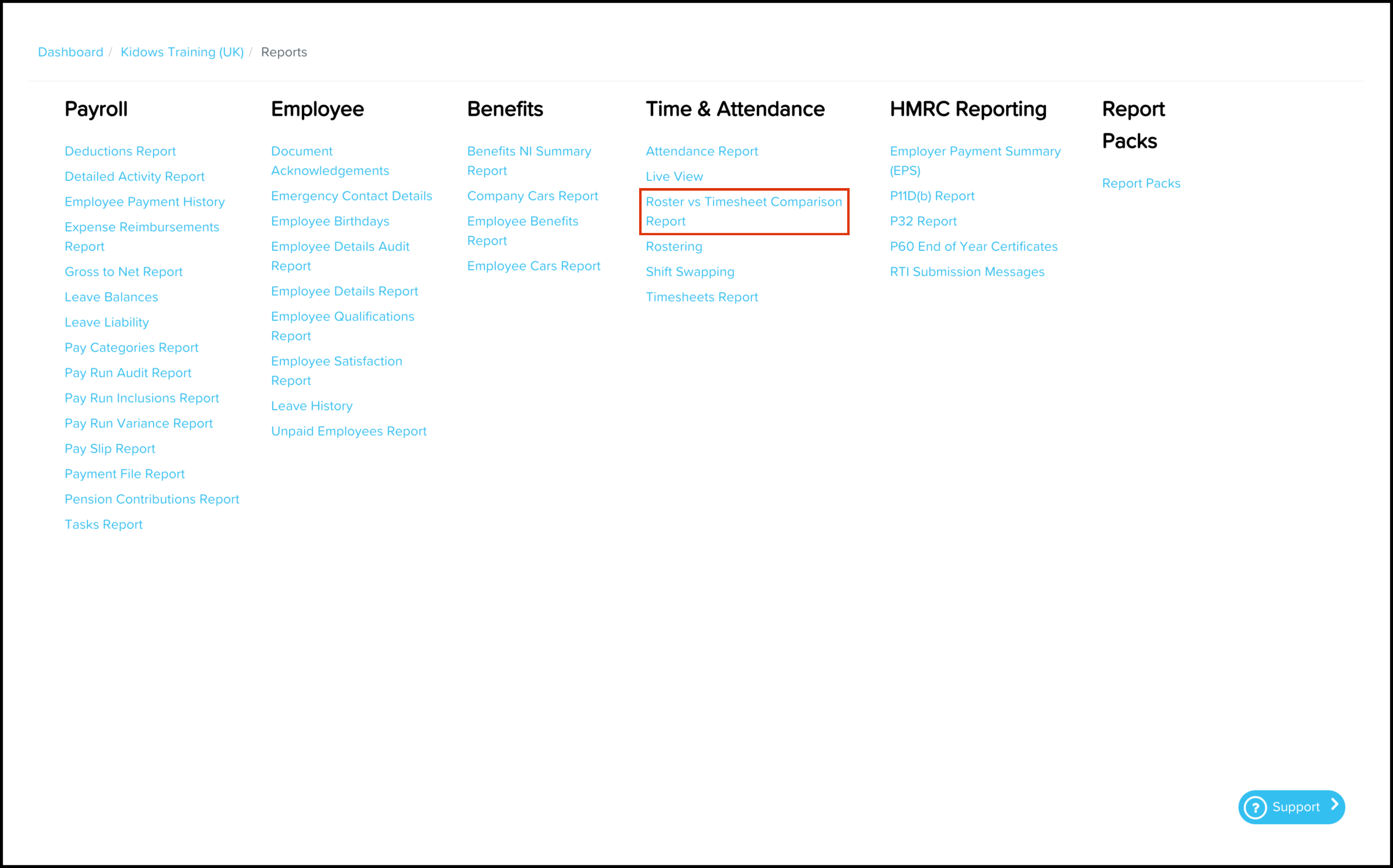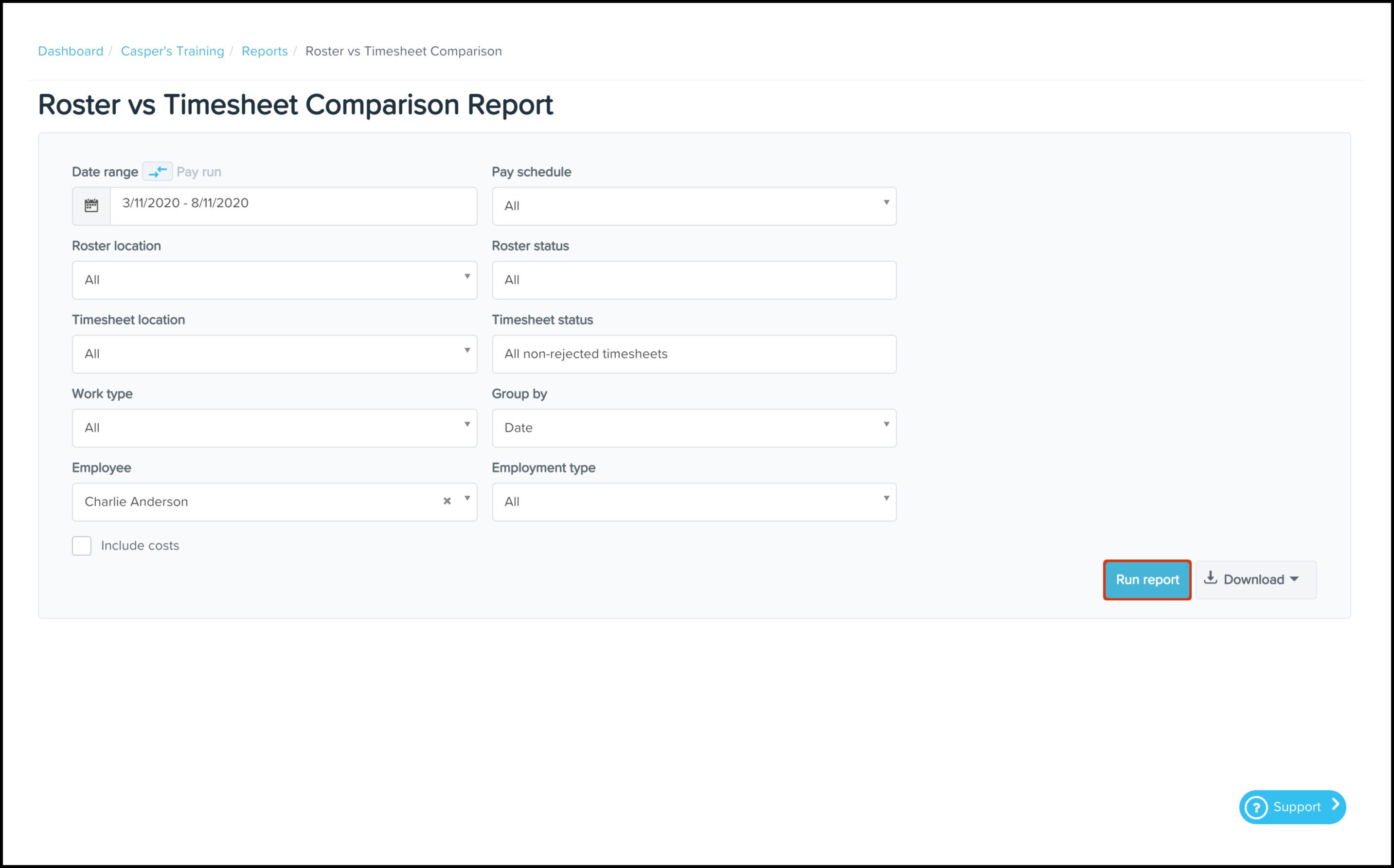 Running a roster vs-timesheet comparison report