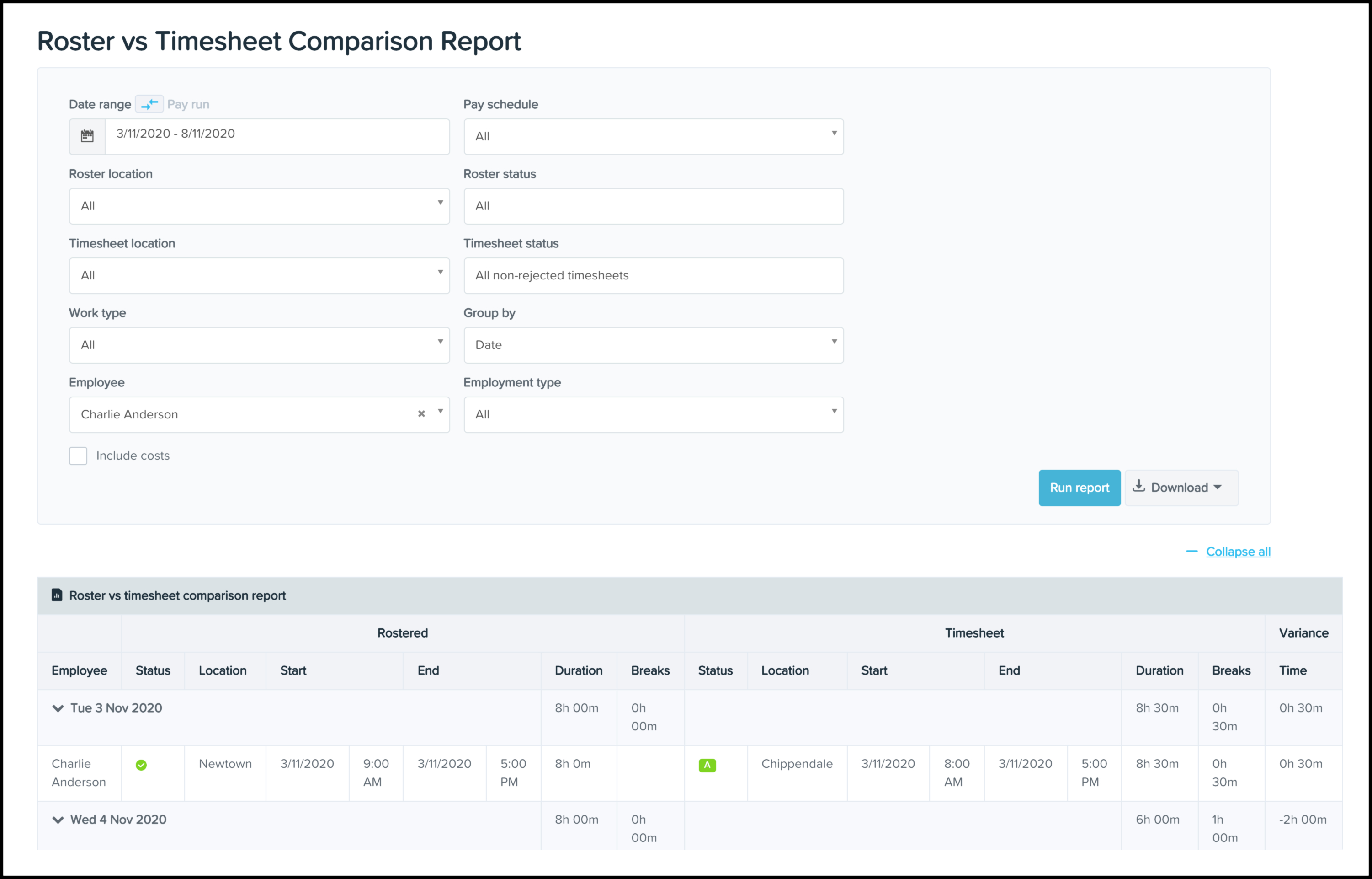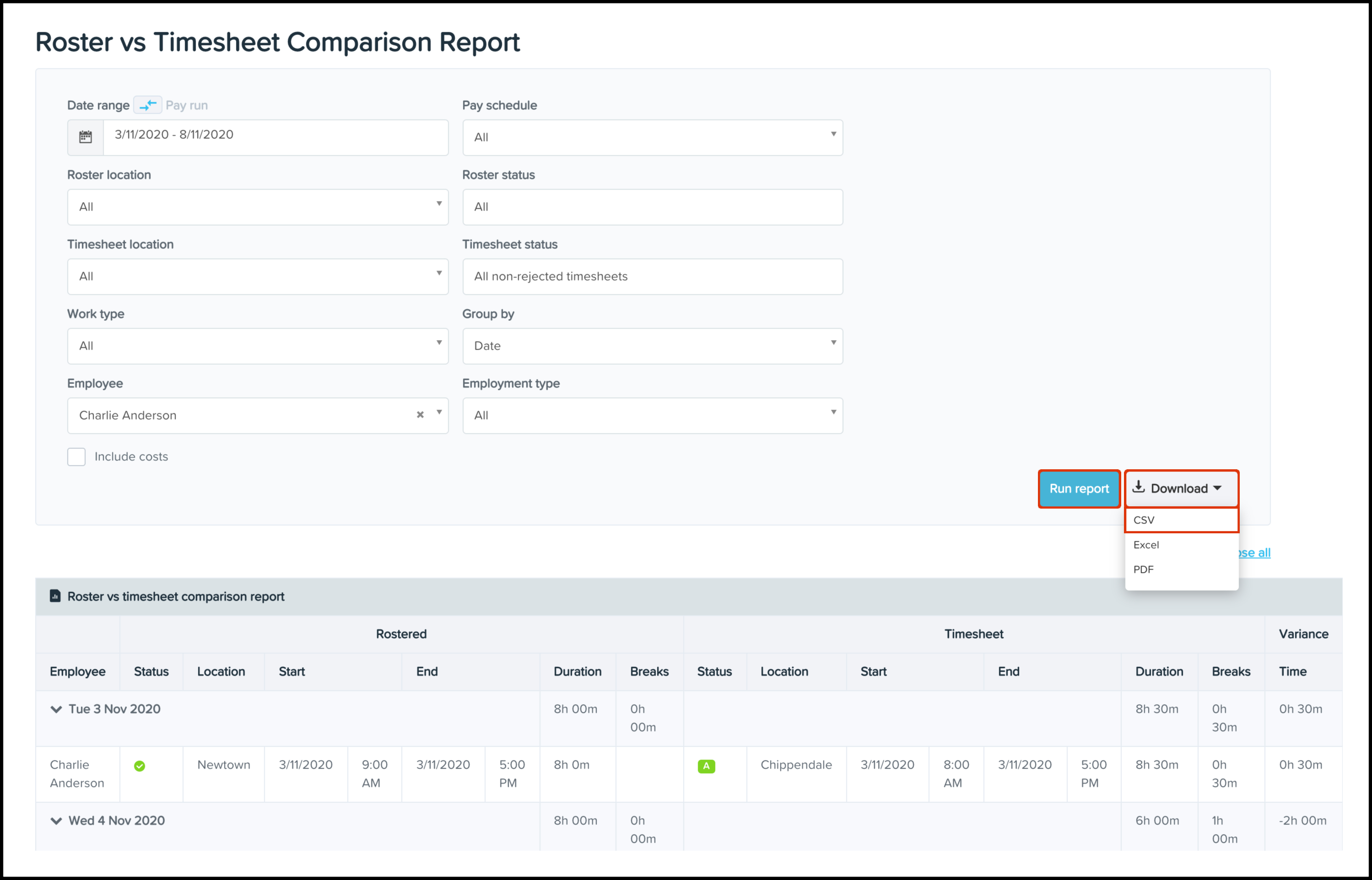 You will now see your Roster vs Timesheet Comparison report on your screen.