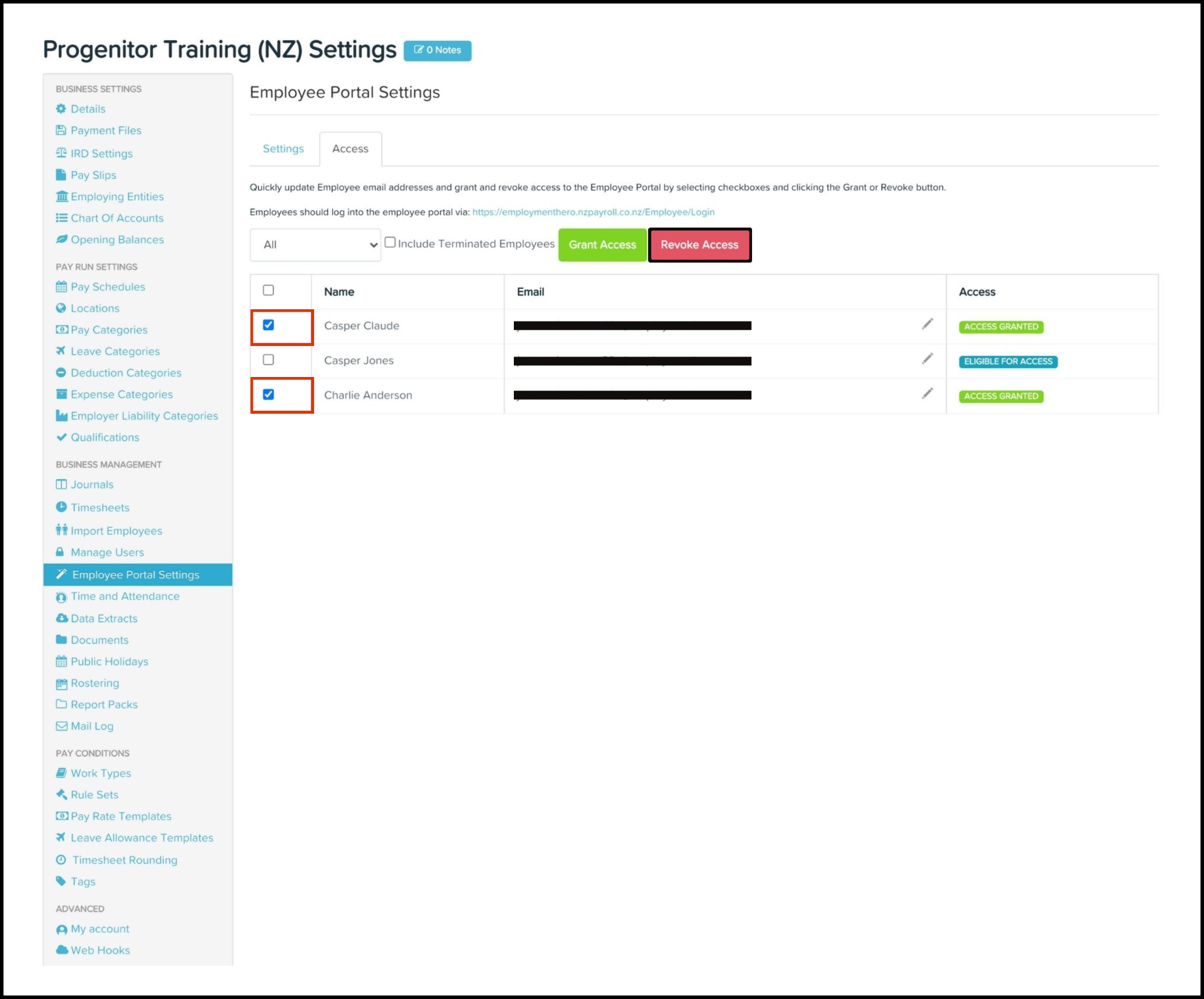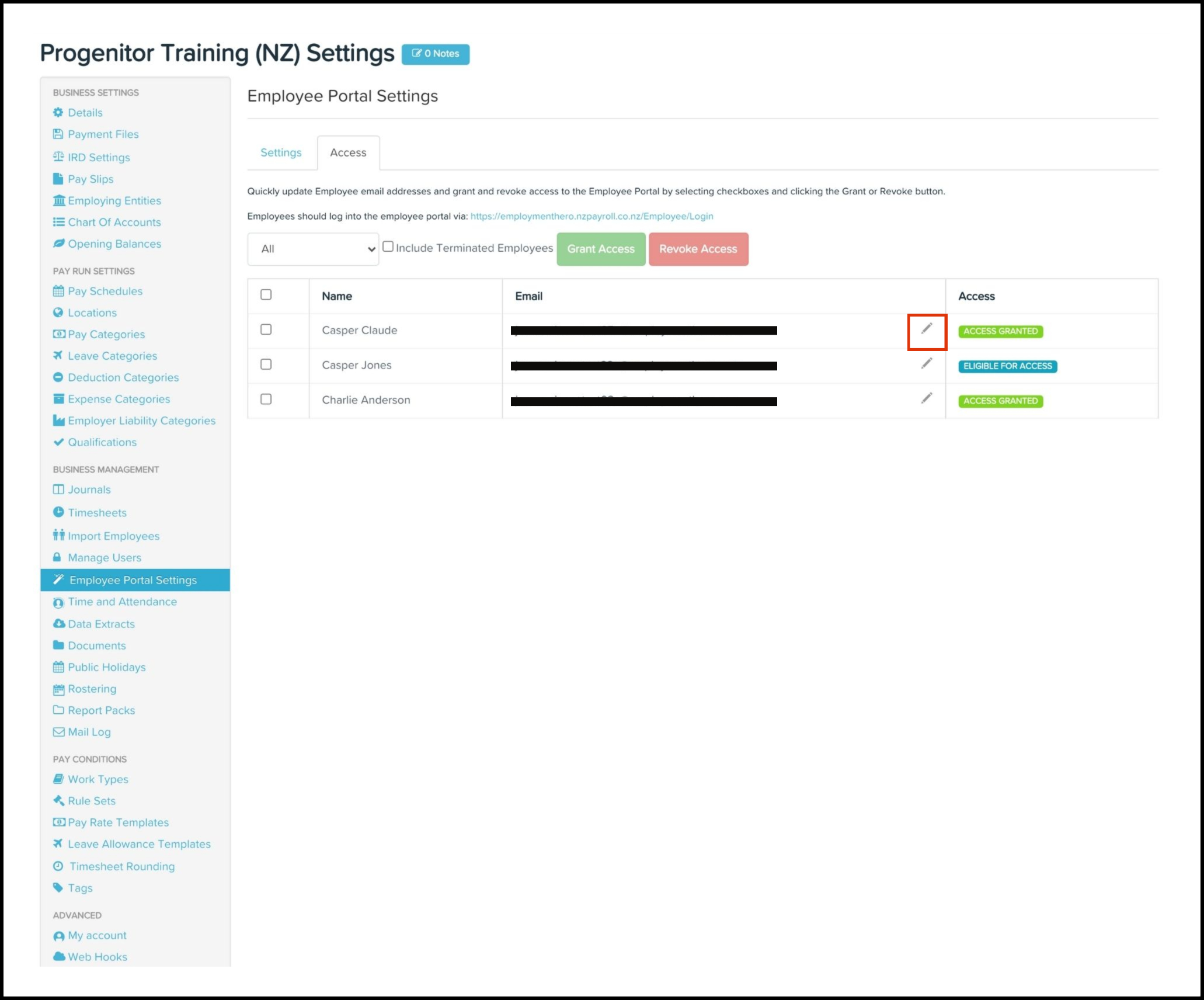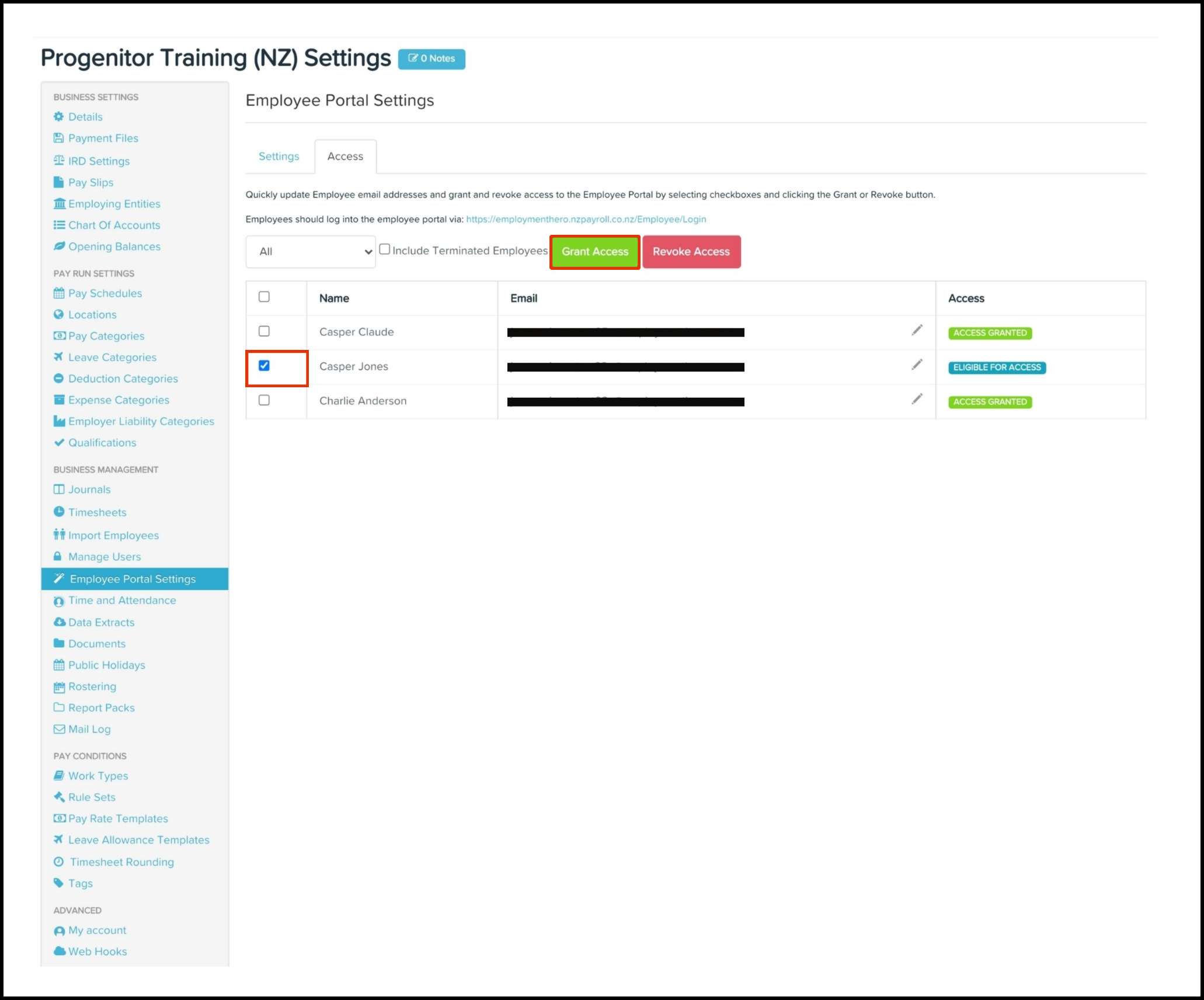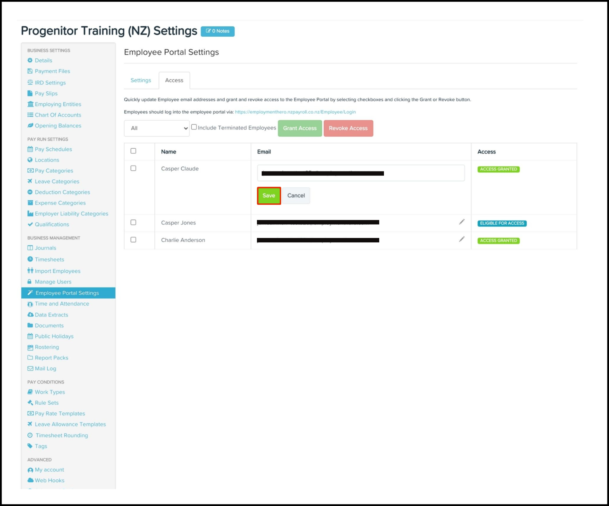 An employee portal is an online employee engagement platform that puts a range of payroll services at the employee's fingertips. The Employee Portal Access Management feature allows you to grant access in bulk to employees who need to use the Payroll self-service portal. You can also use this feature to edit an employee's access email and revoke access if it is no longer required.
