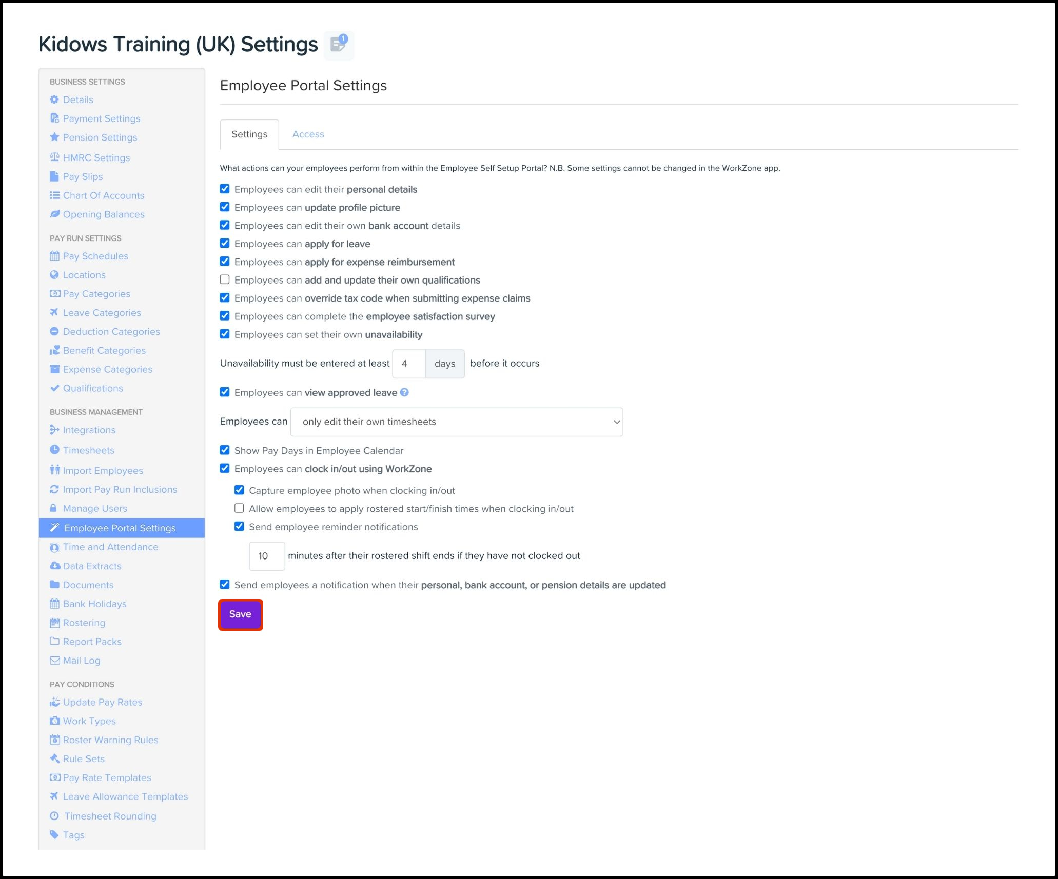If an employee is given Roster Access through Custom Security Settings in Employment Hero, then they are also given the employee access in the payroll platform.