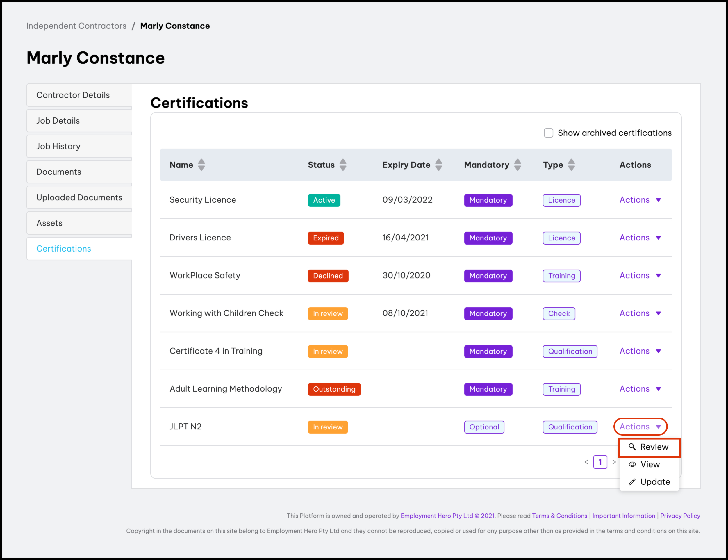 Within your organisation, you may have contractors that require a certain qualification, pass certain training courses, or hold a particular license. As an example, certifications can form a requirement for certain roles, such as a security guard needing a security license.