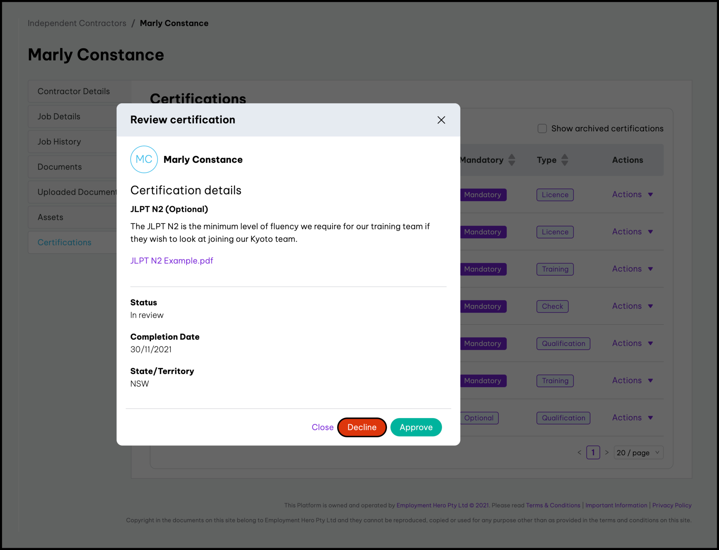 - Select the contractor that needs a certification declined.