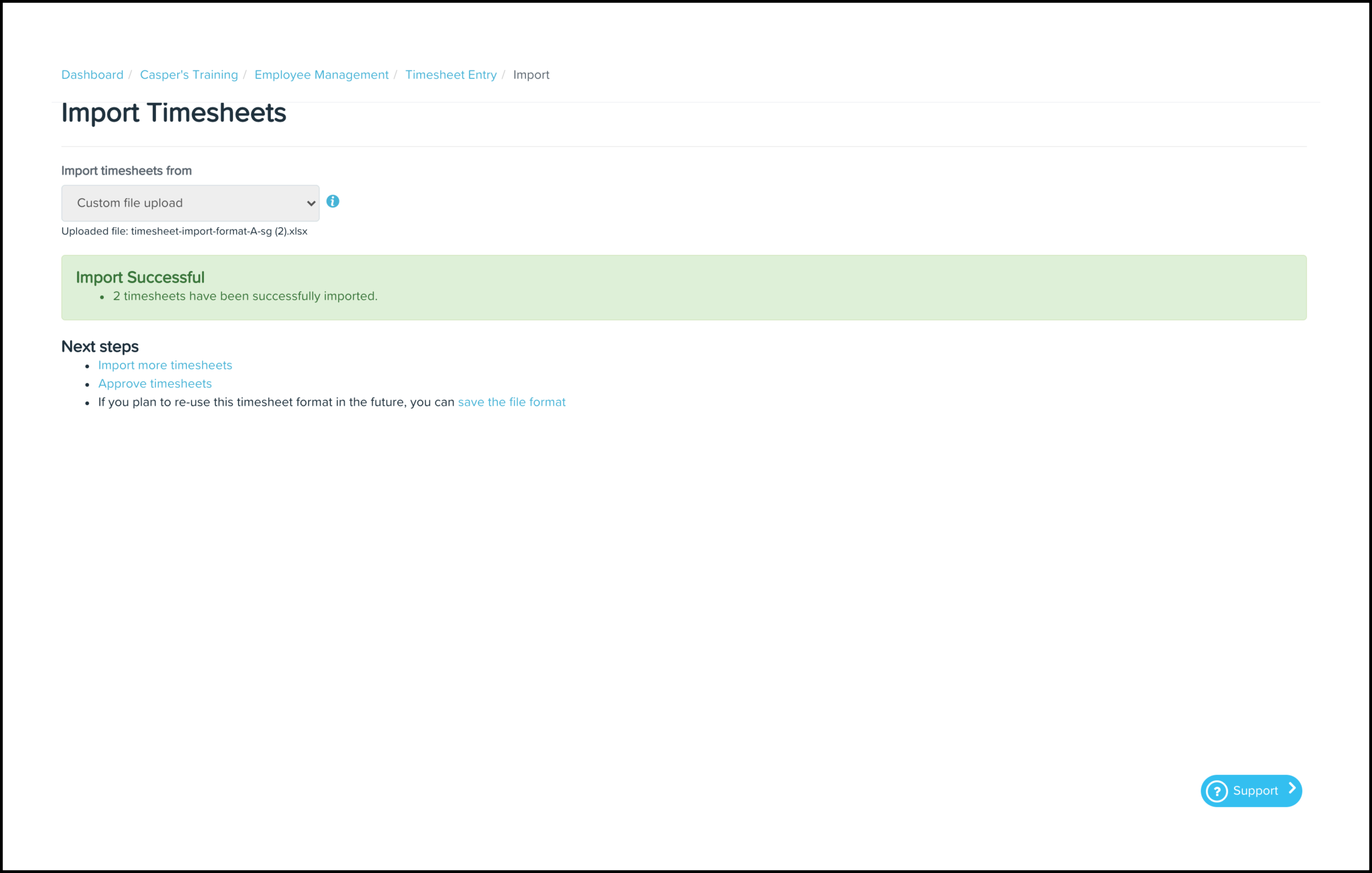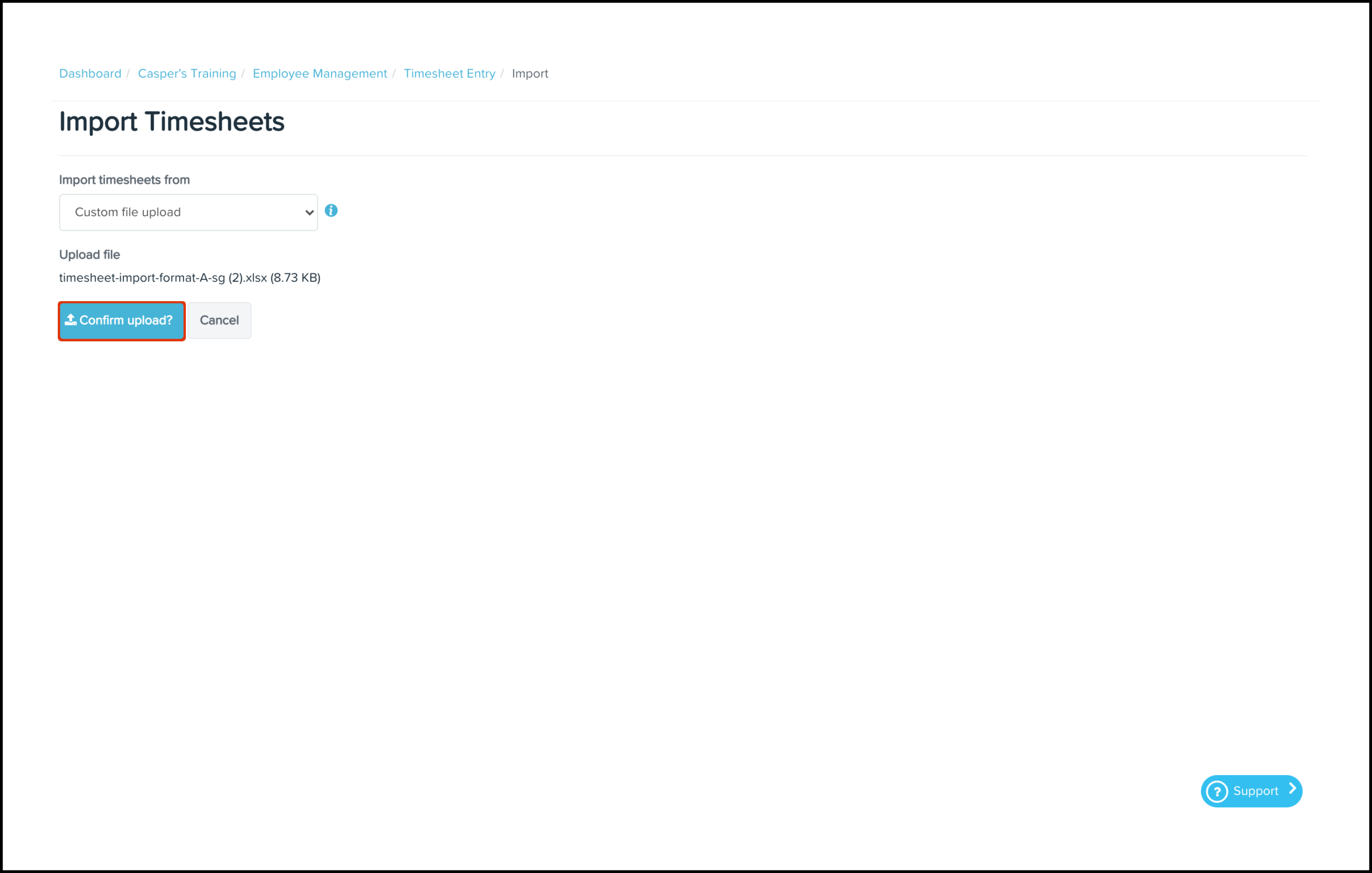 - Select the Custom File Upload option in the Import Timesheets drop-down.