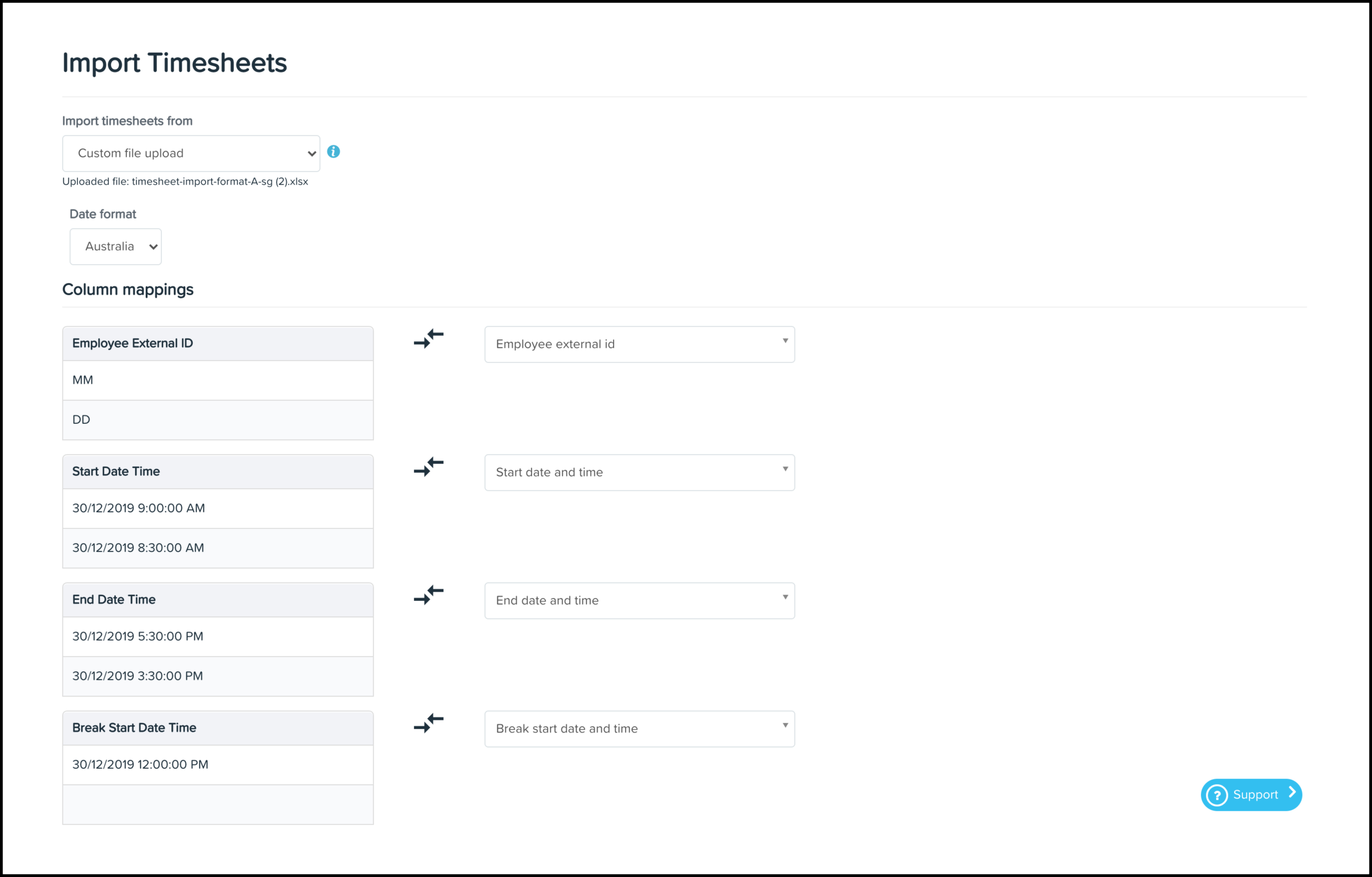 - The import will fail if you enter a timesheet date that falls before the employee's start date.