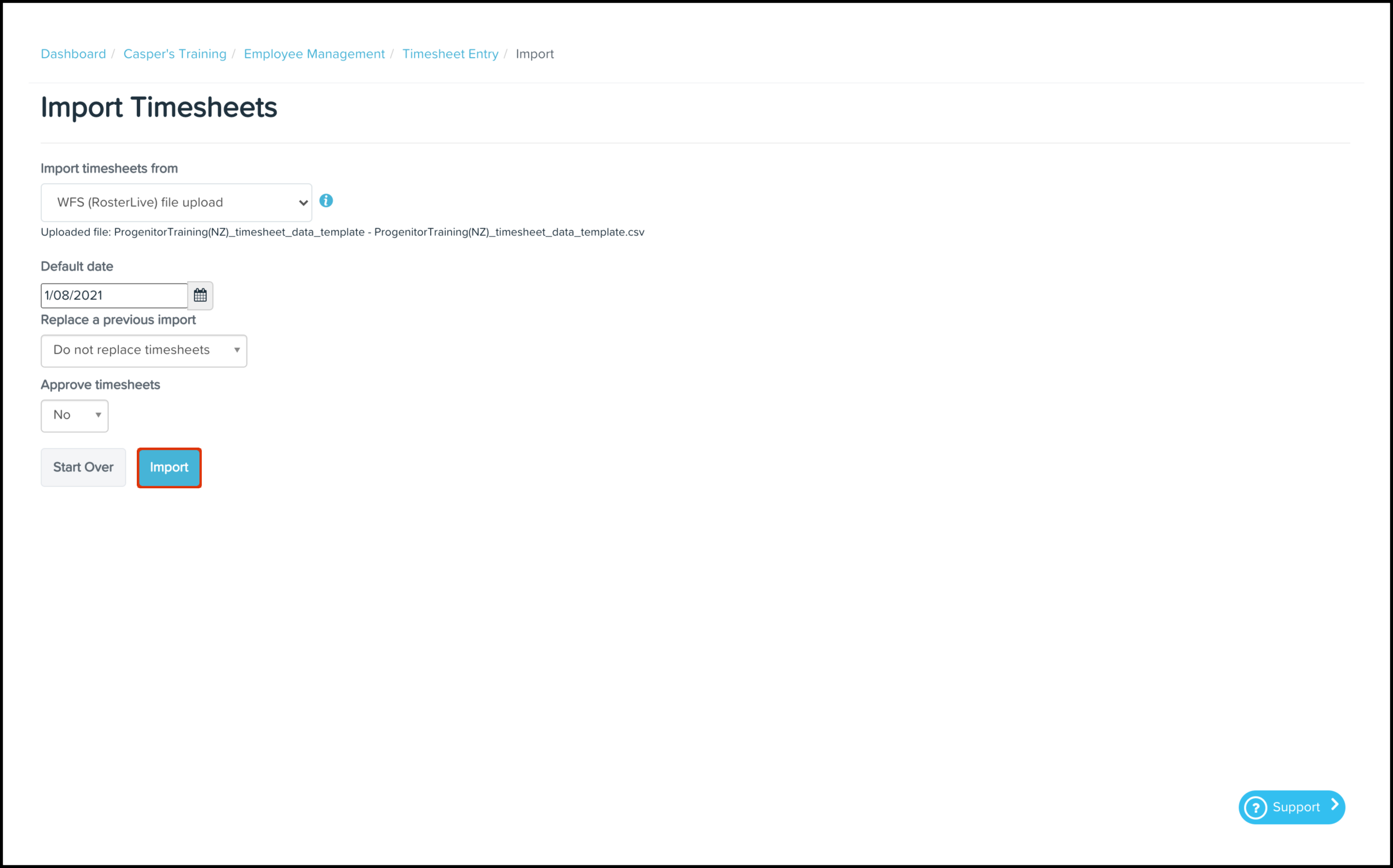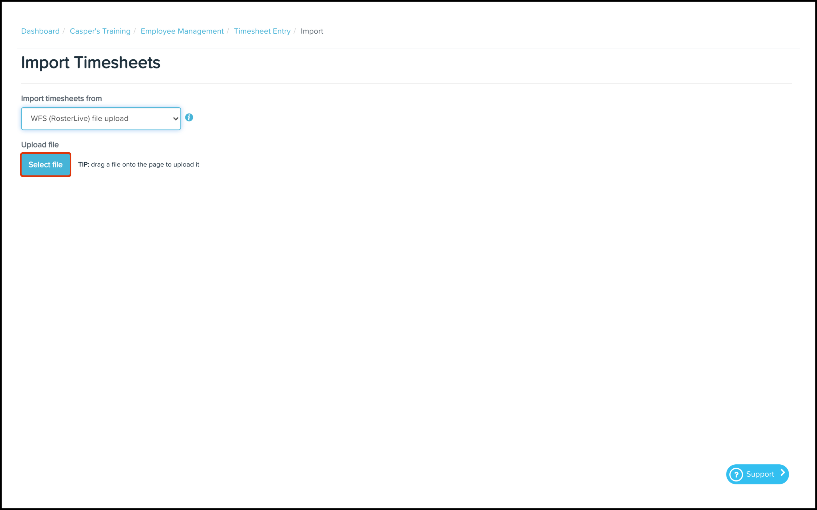 - Select the WFS (Roster Live) option in the Import Timesheets drop-down.