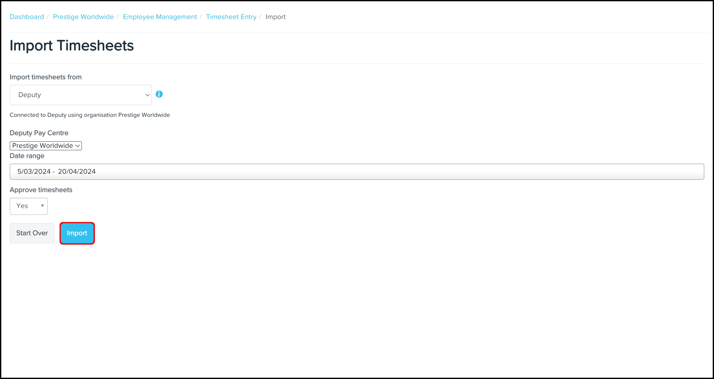 The Approve Timesheets option allows you to choose whether the platform automatically approves the timesheets when imported or whether they need to go through your organisation's timesheet approval workflow.