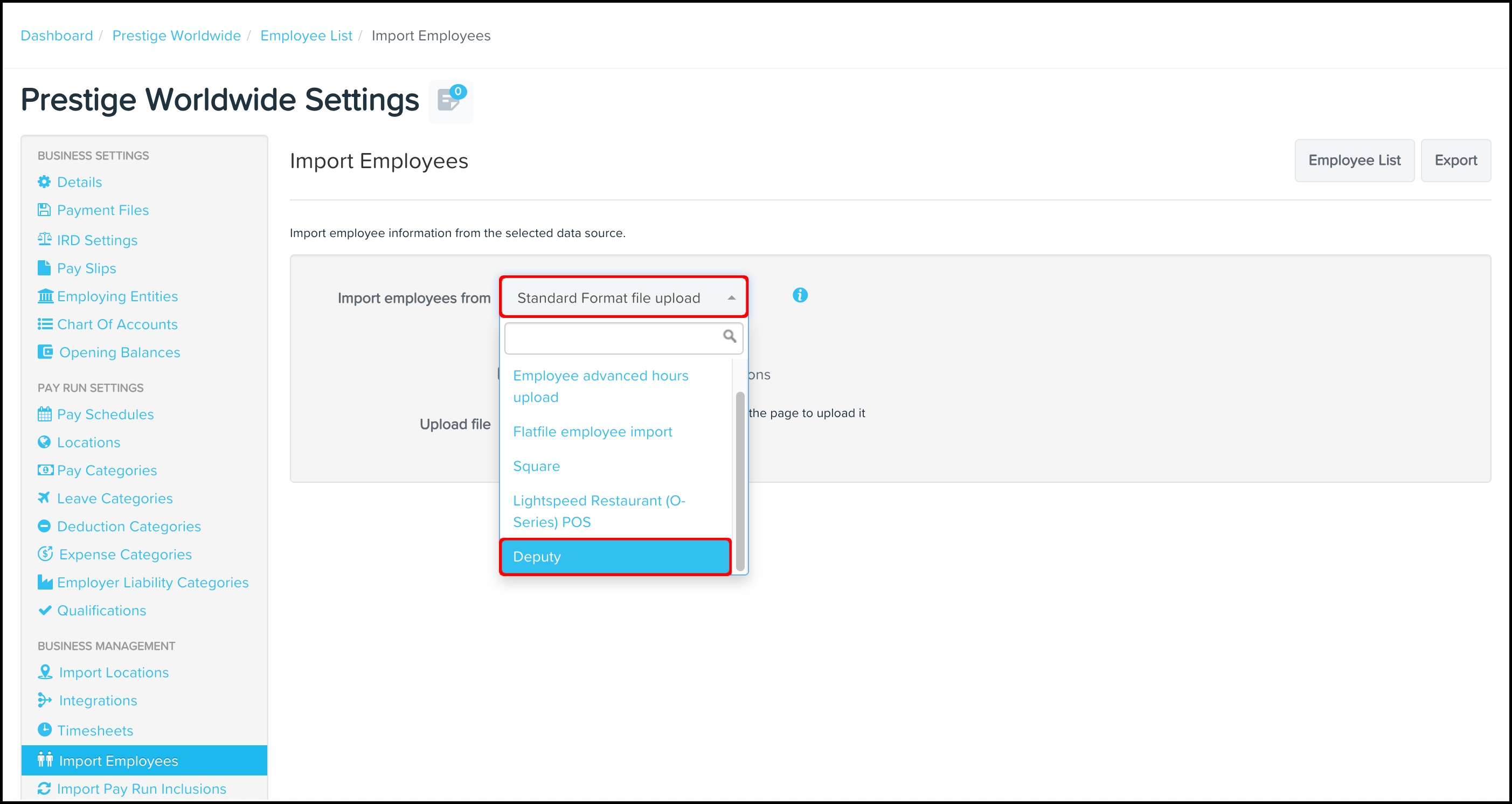 When importing timesheets from Deputy Enterprise, your employee and location data within your Payroll classic platform must match the data from your Deputy Enterprise. We recommend using the Import Employees feature to make sure you have a matching employee and location data between the two platforms.