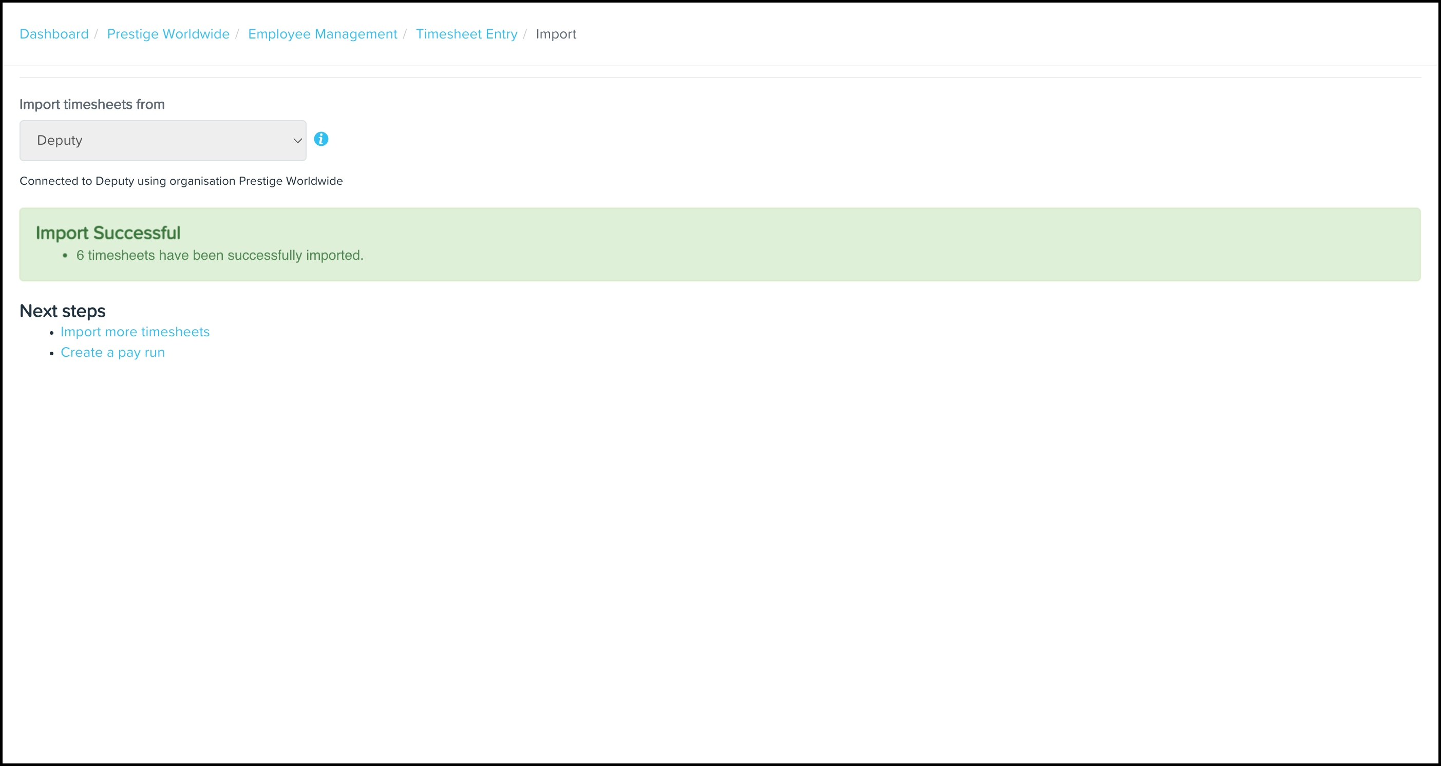You will now see a status message showing the successful uploading of your timesheets from Deputy into your Payroll classic platform.
