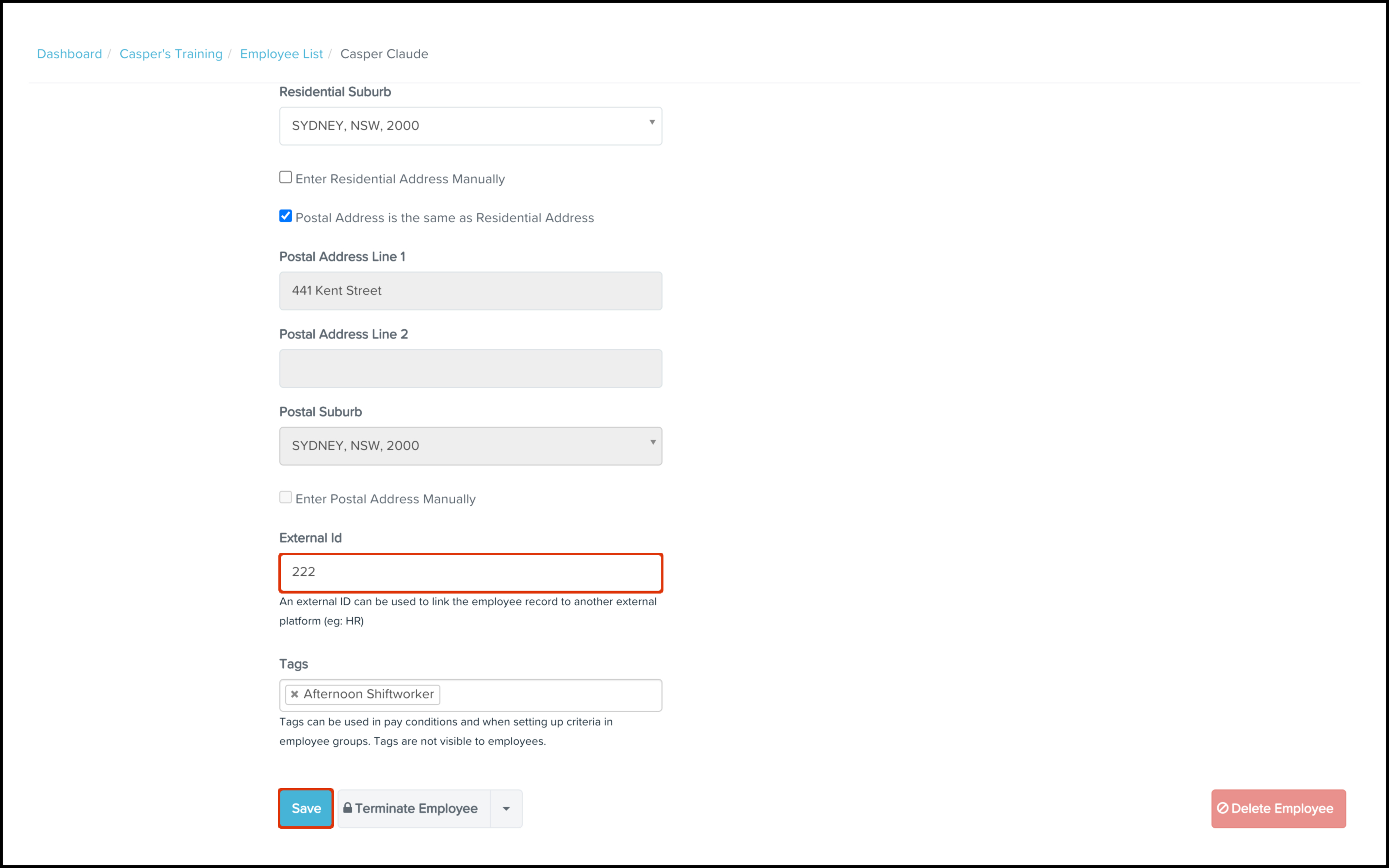 The next step is to add your employee timesheet code used in your Deputy Standard or Premium platform into the relevant Employee File External ID field within your payroll platform. The steps on how to undertake this are: