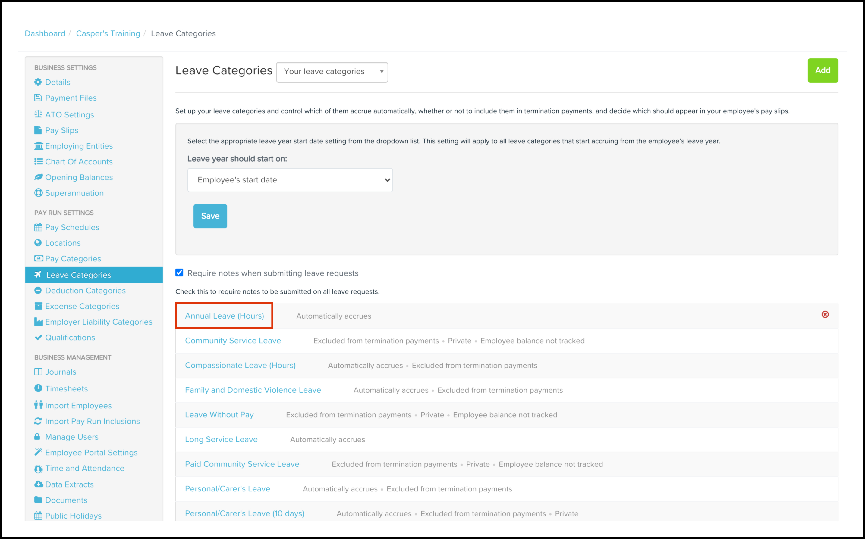 - Next, go to your Employment Hero payroll platform and add a new work type. To do this go to Business settings, then under Pay conditions choose Work types, then click Add.