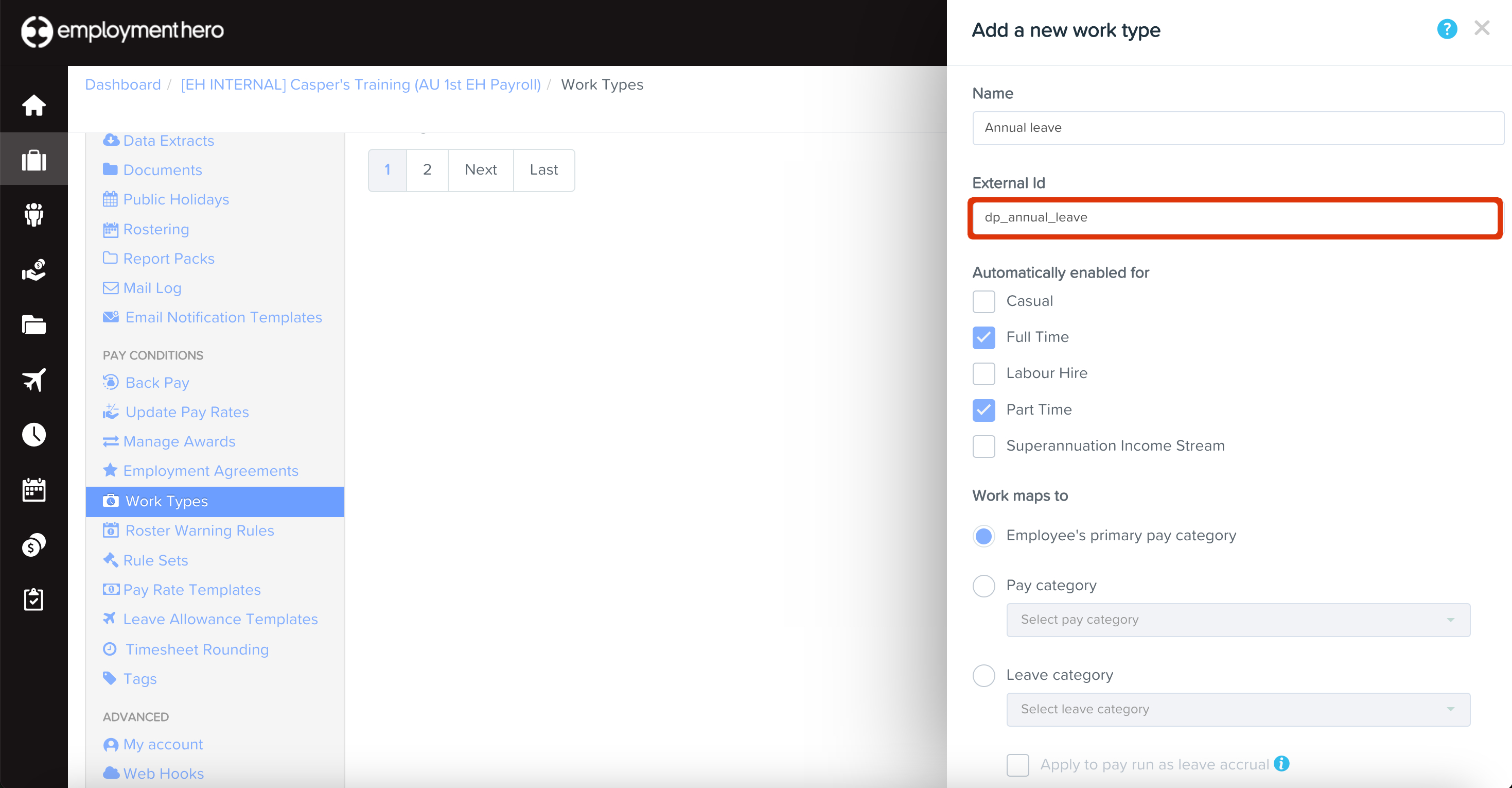 - Fill in the details of the work type and use the Export code from Deputy in the External ID field.