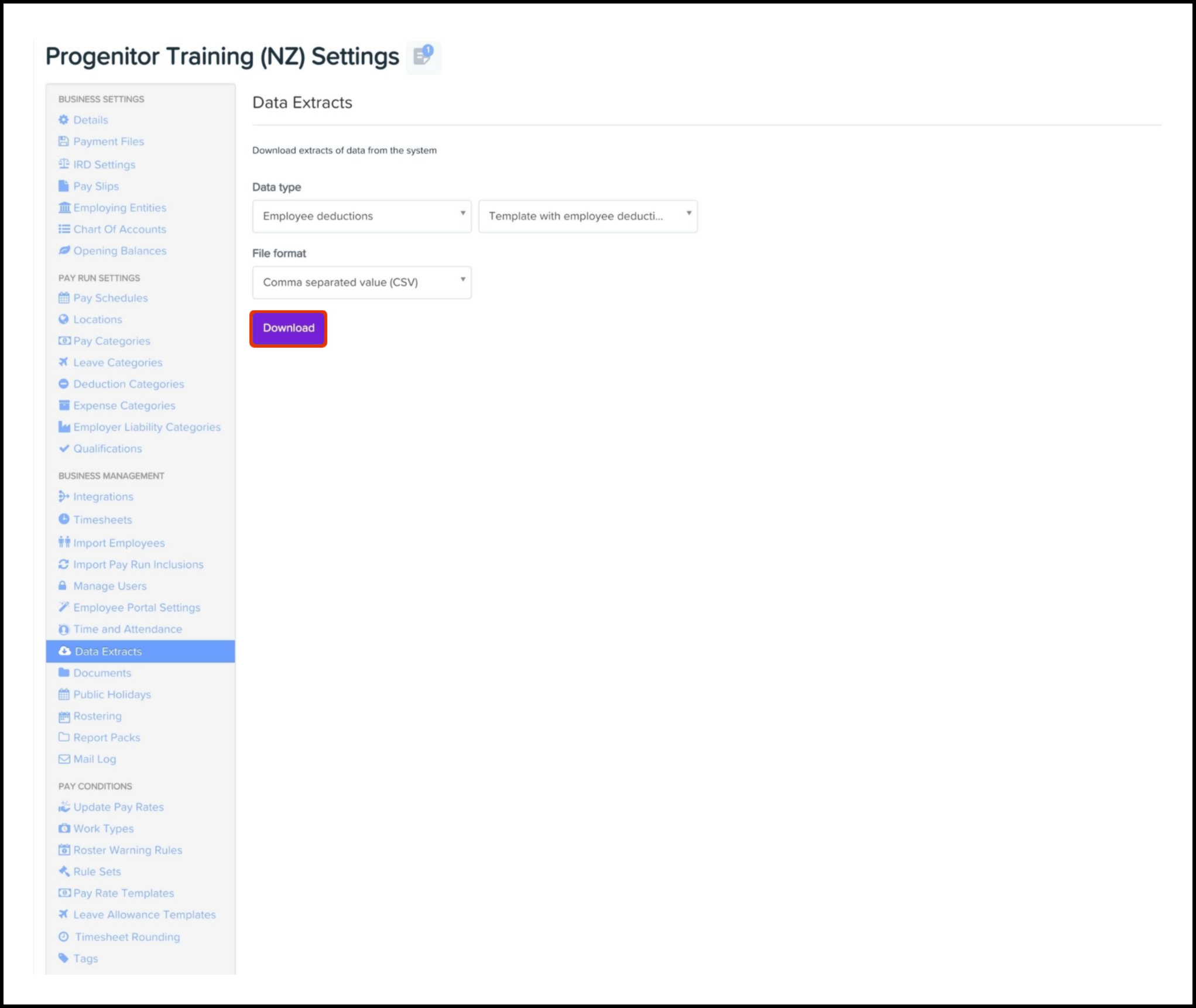 The Data Extract feature enables you to download your employee deductions stored within your Payroll classic platform as either an XLSX or CSV file.
