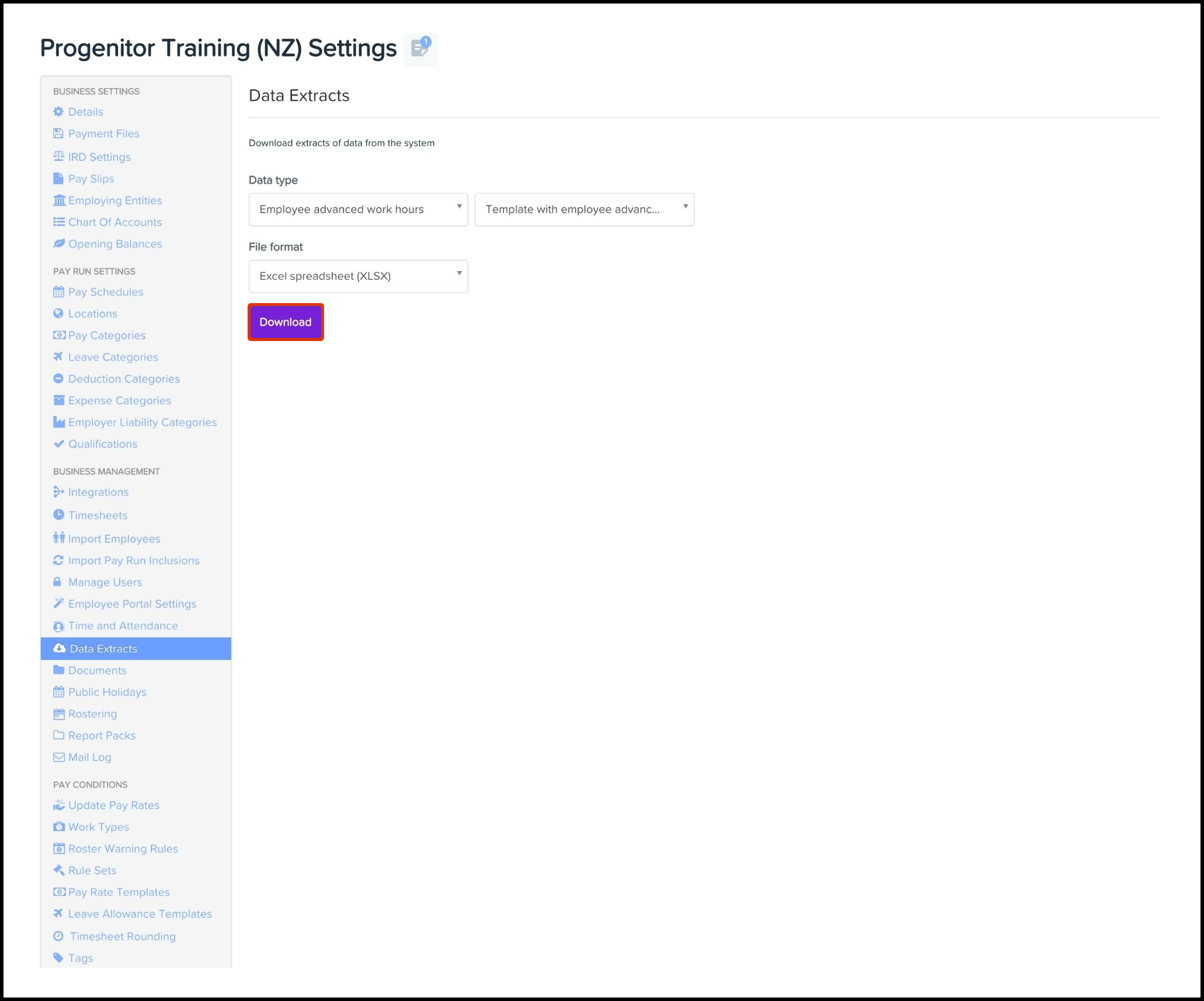 The Data Extract feature enables you to download your employee advanced work hours data stored within your Payroll classic platform as either an XLSX or CSV file.