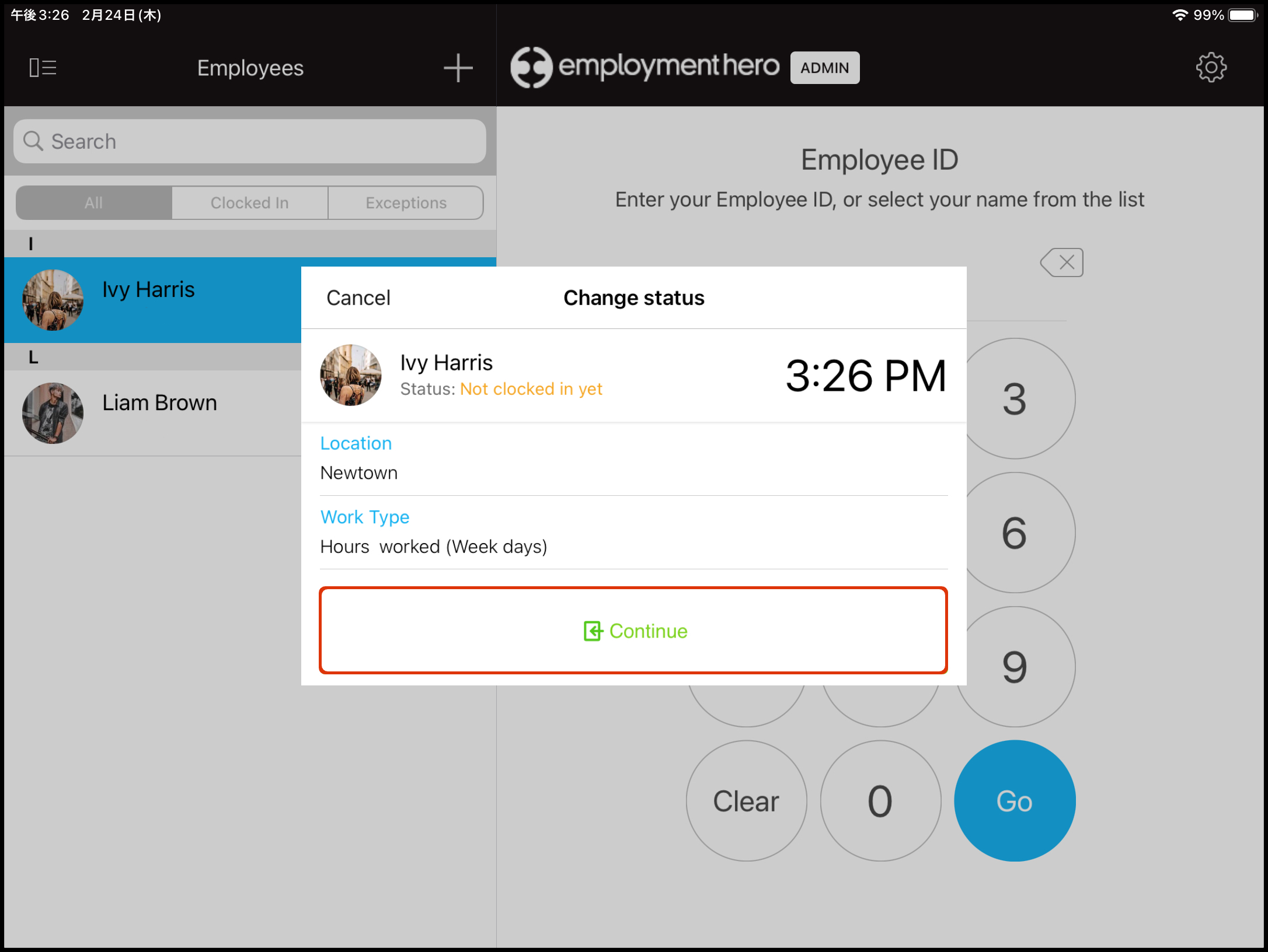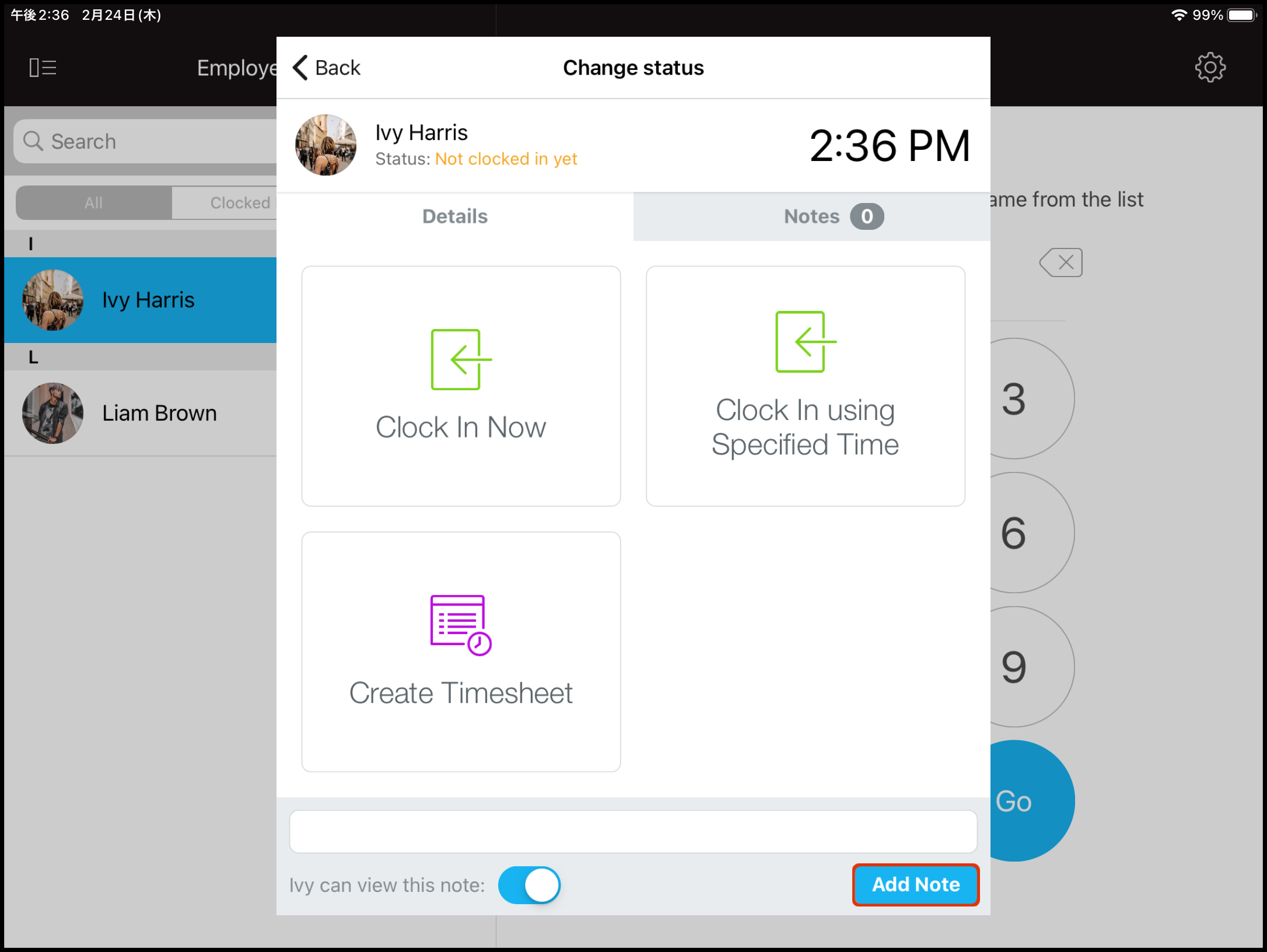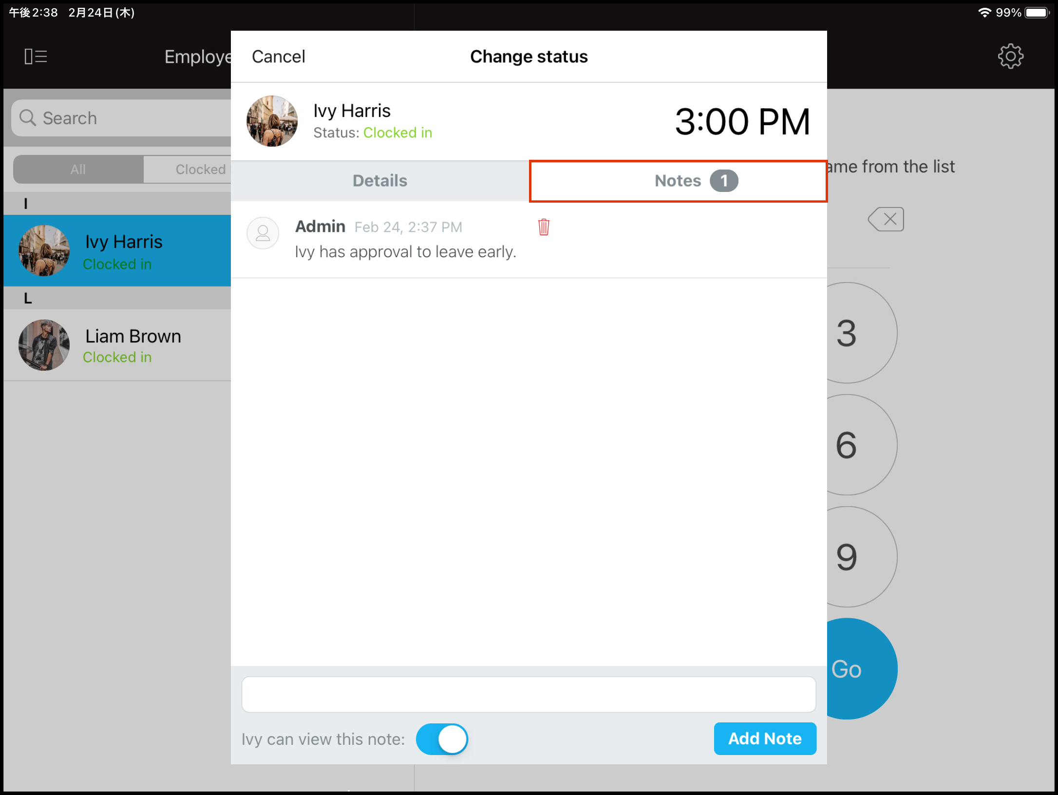 The Notes feature on the Clock Me In app (downloadable for iPad users on Apple's App Store) allows you to select an employee and create a note against their clock in record. You can also use this feature to view the details of a note and delete an entry if it is no longer required. You will need to have enabled Admin Mode first before you can access this feature.