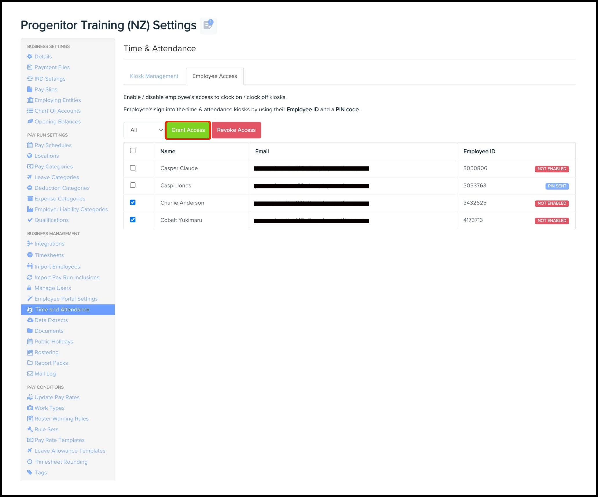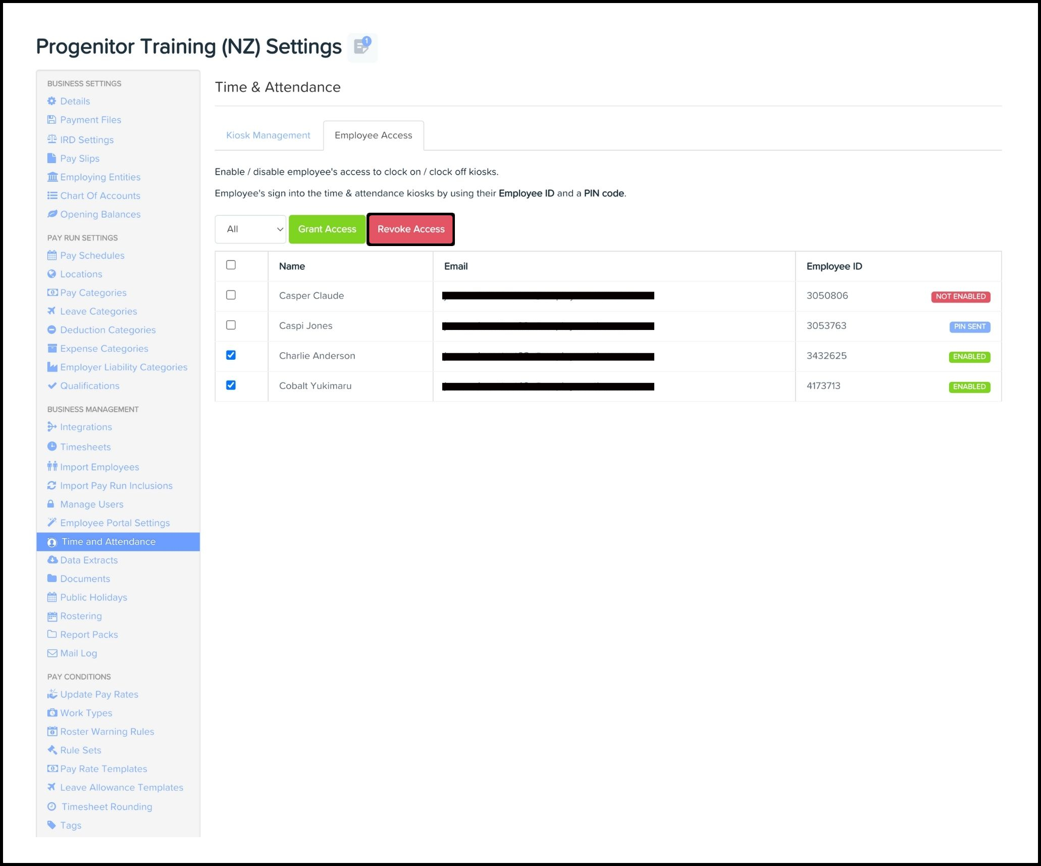 The Time and Attendance Access Management feature allows you to grant access in bulk to employees who need to use your Clock Me In iPad app (downloadable for iPad users on the App Store). You can also use this feature to revoke an employee's access if they no longer need to clock in for work.