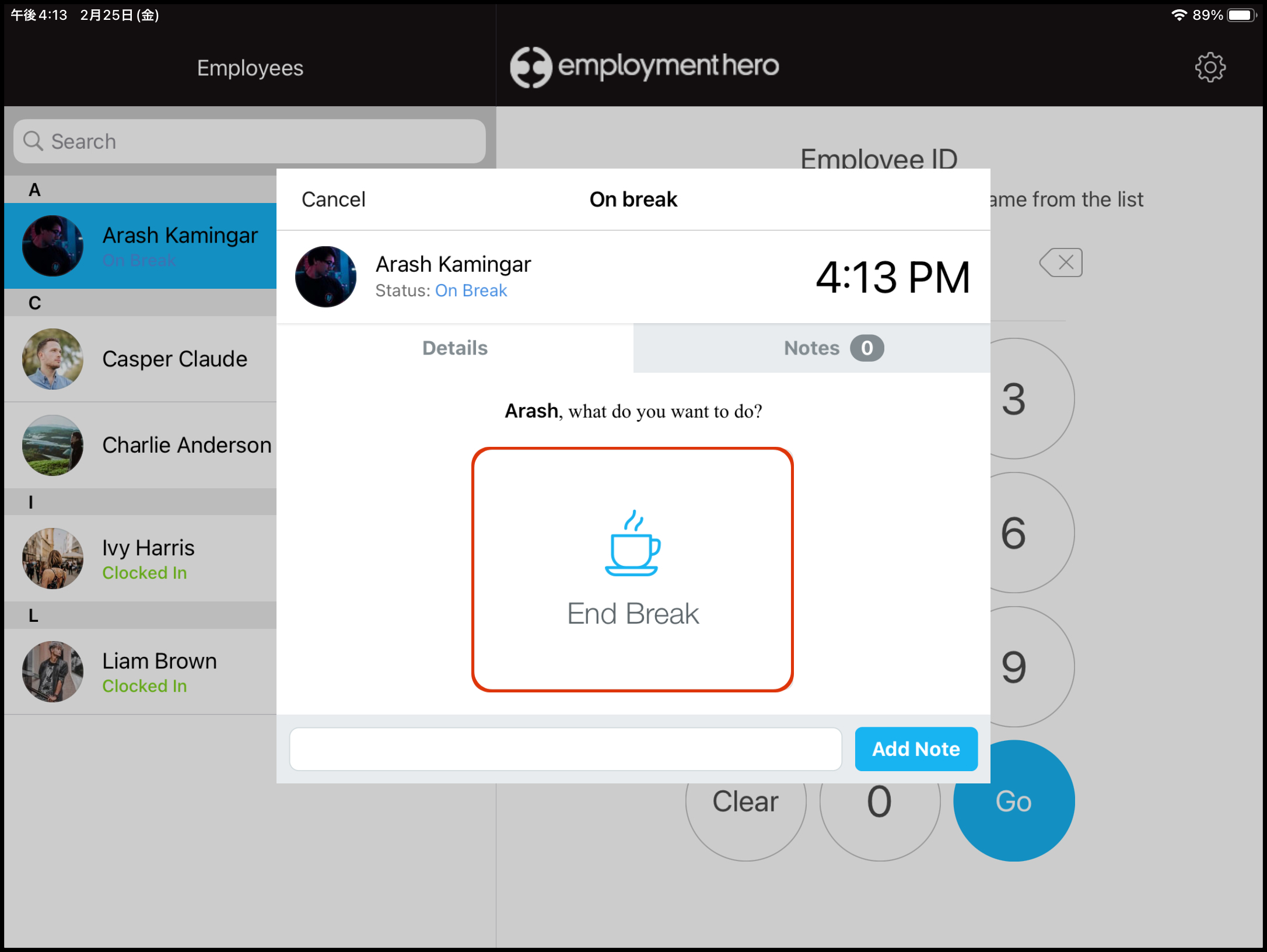 The Clock Me In feature (Note: If you are looking for the Clock Me In iPad app rather than the Clock Me In feature, visit Apple's App Store) allows an employee to submit their start and end shift times and log any breaks they have taken during their working hours. The feature also allows an employee to change their work type and location if needed, and add any required notes to their clock in submission.