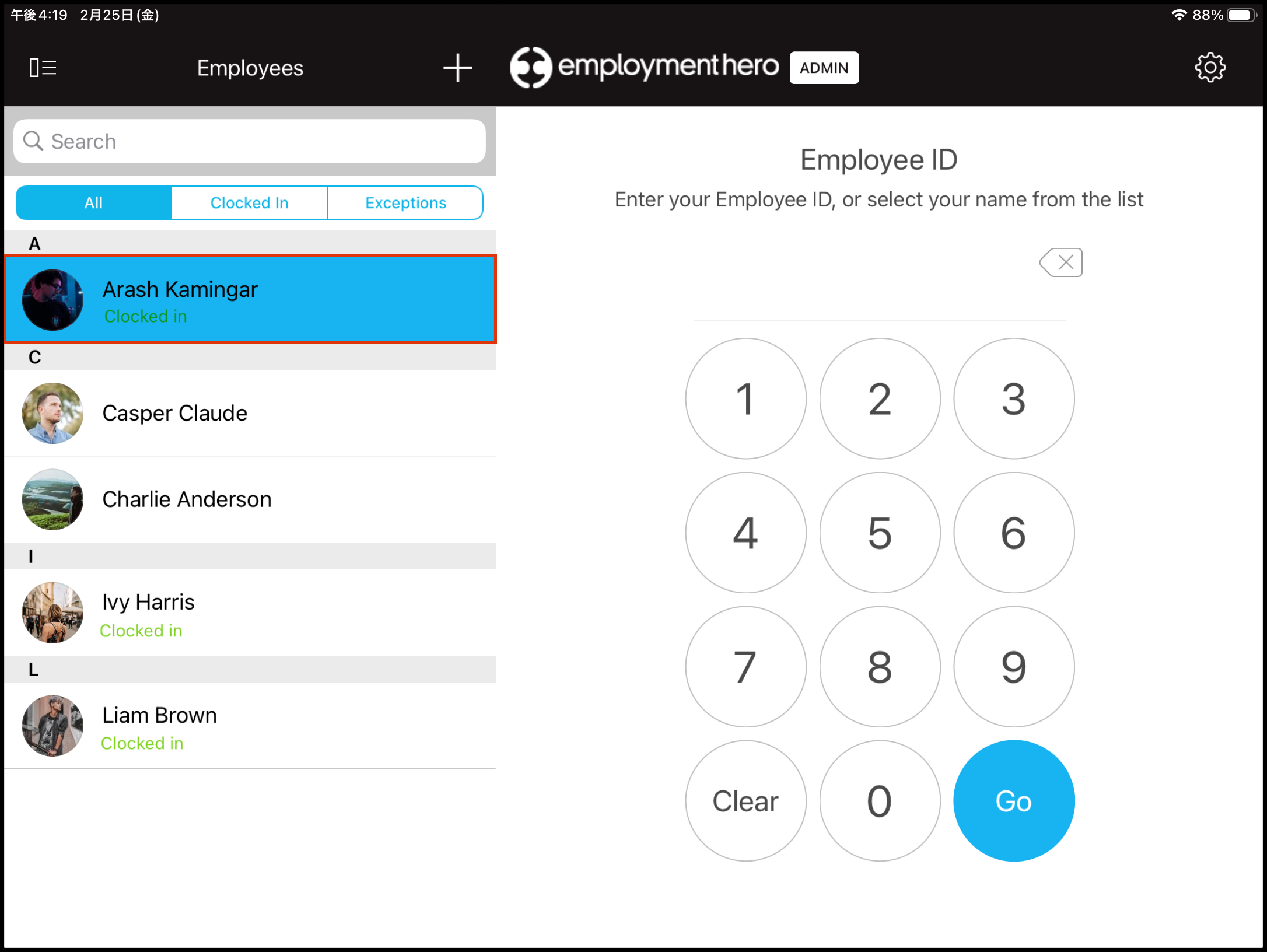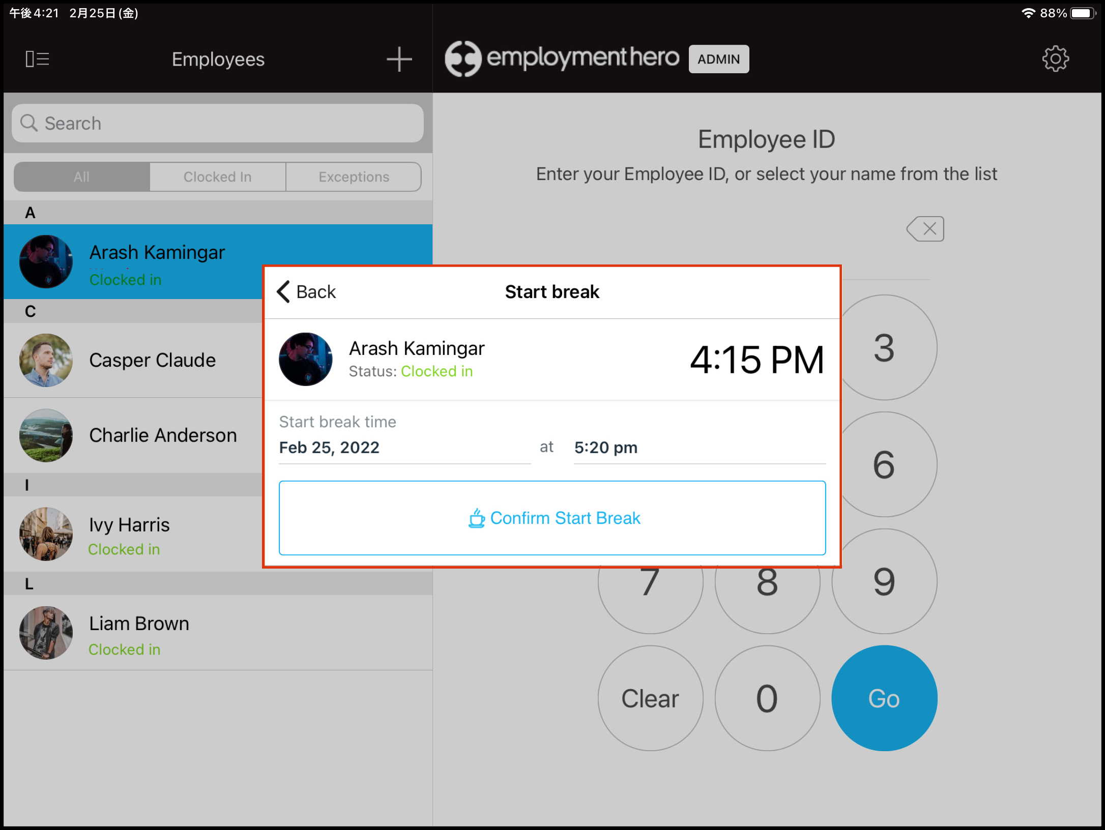 The Start Break Using Specified Time function on the Clock Me In app (downloadable for iPad users on Apple's App Store) allows you to start an employee's break at a pre-determined time. You will need to have enabled Admin Mode first before you can access this feature.