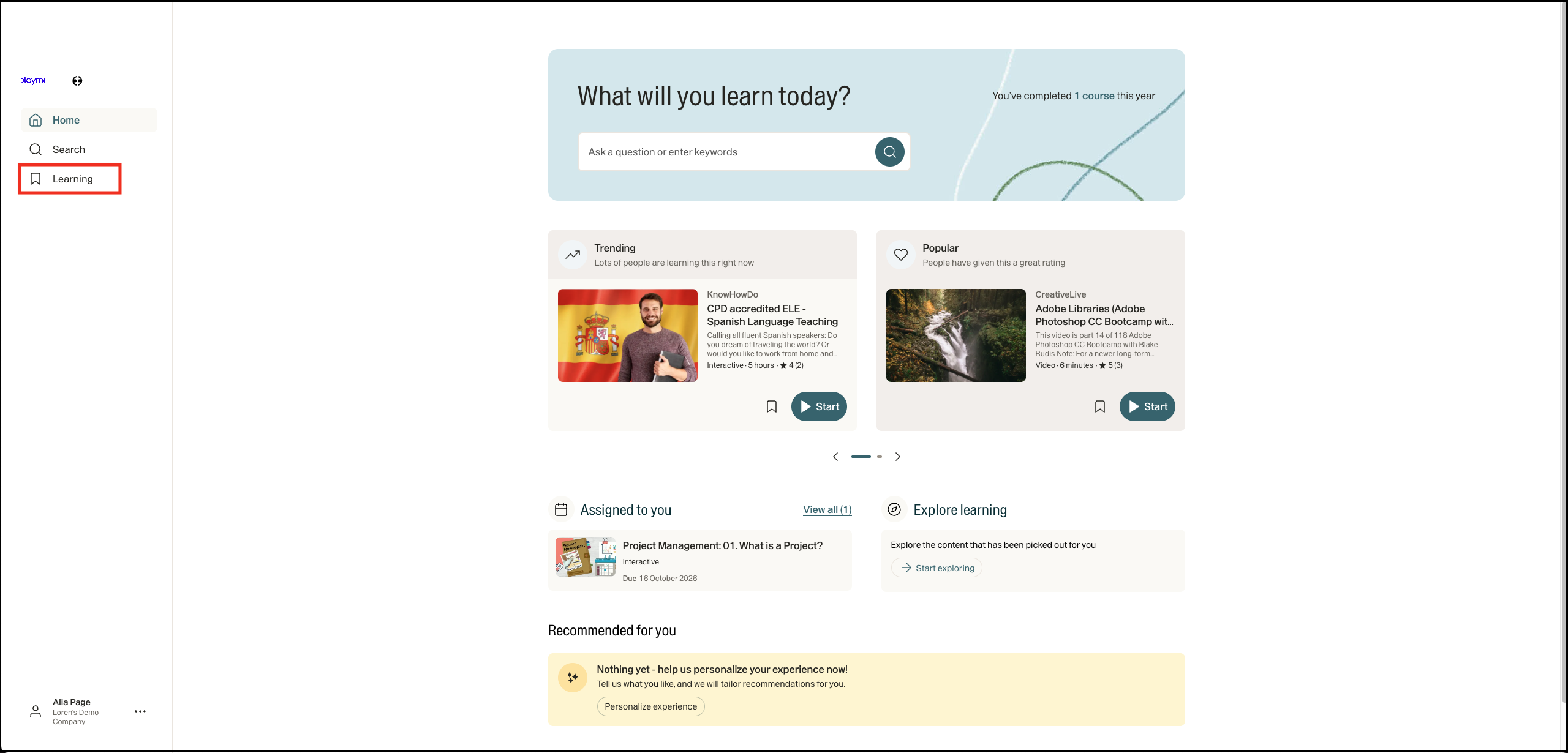 From here, they can find what they wish to remove, click the three dots button, and then click the Remove or Leave Course button. For standalone items, and interactive files that have been assigned, learners can remove the items from their dashboard or My Learning page. If the interactive file is in progress, the learner will need to ask their administrator to delete their enrolment from it instead.