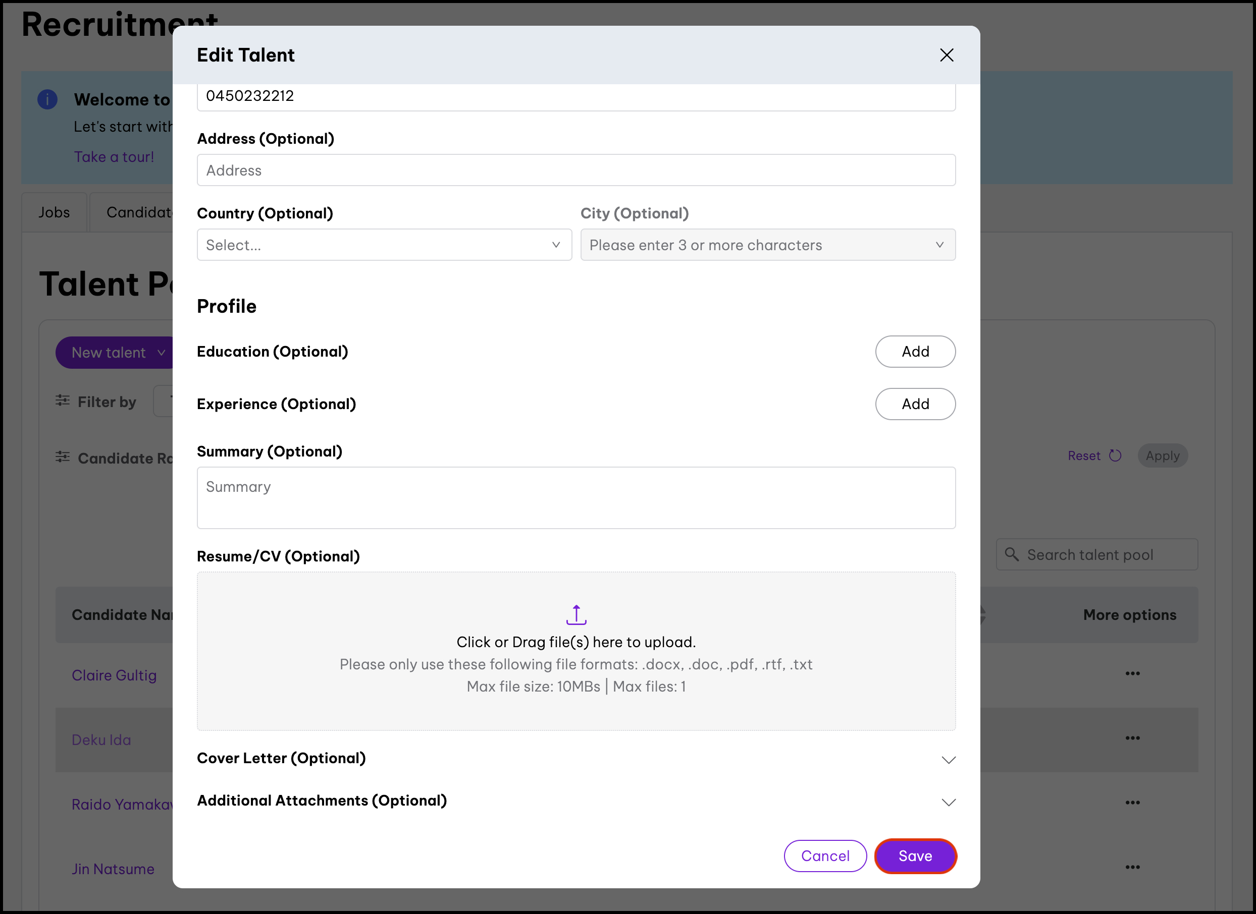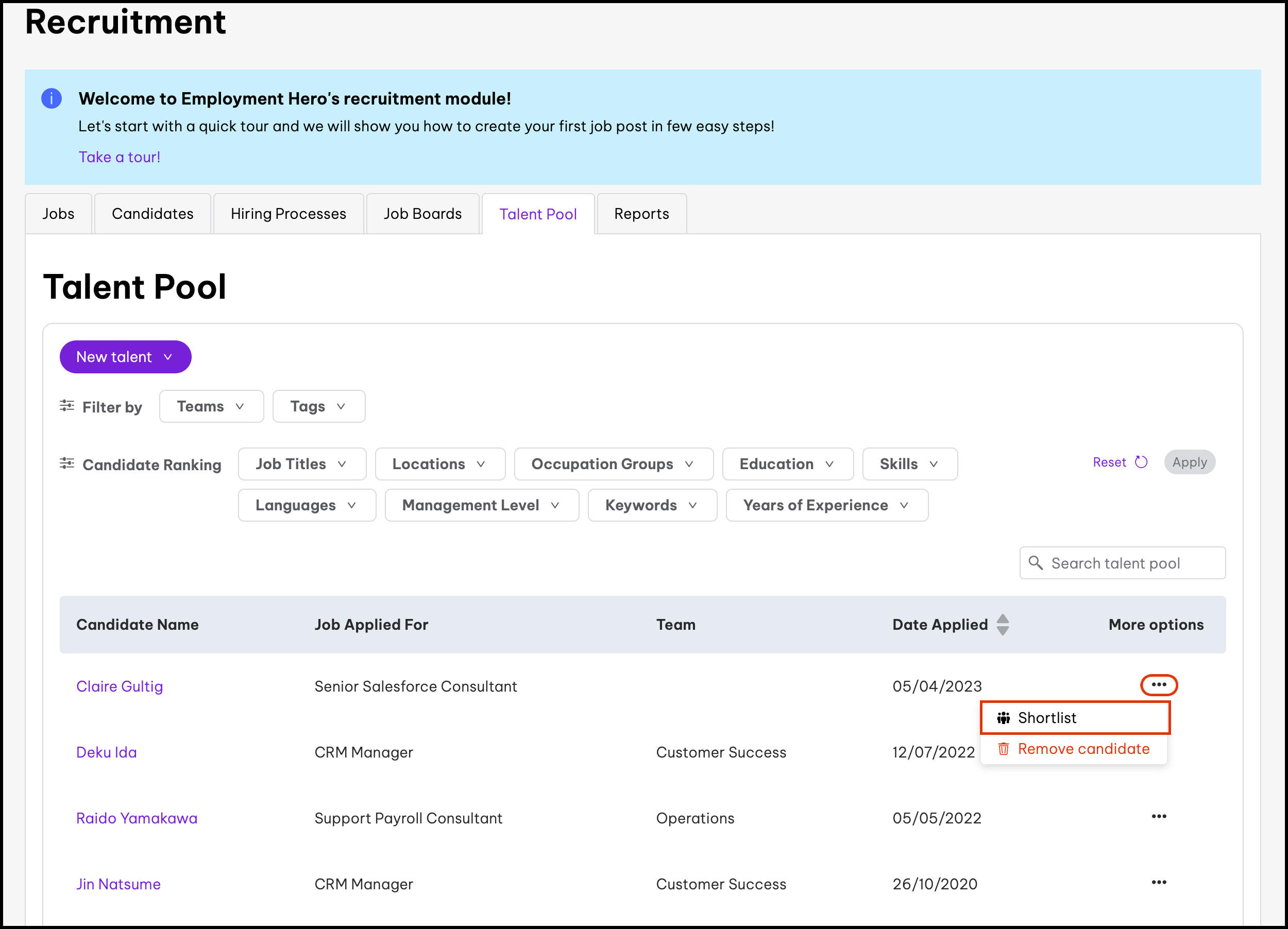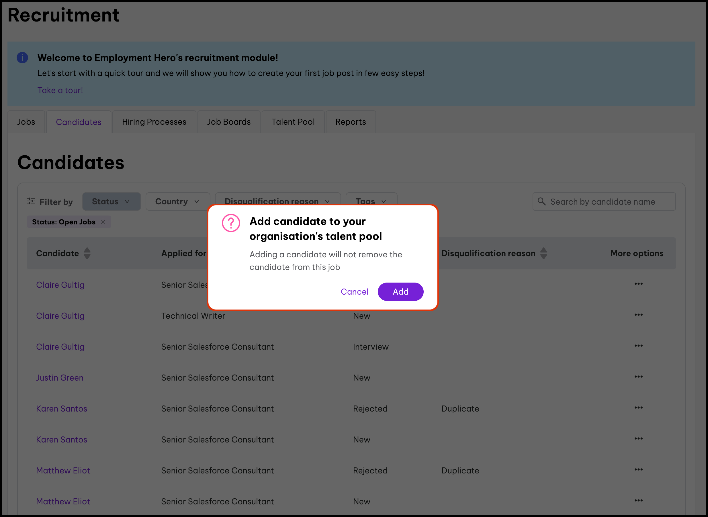When you are in the Talent Pool for the first time, you will see we encourage you to revisit candidates you have previously disqualified from other roles and add them to Talent Pools for possible future positions. It is important to maximise the possibility of always hiring the people best suited for every role and to stay competitive.
