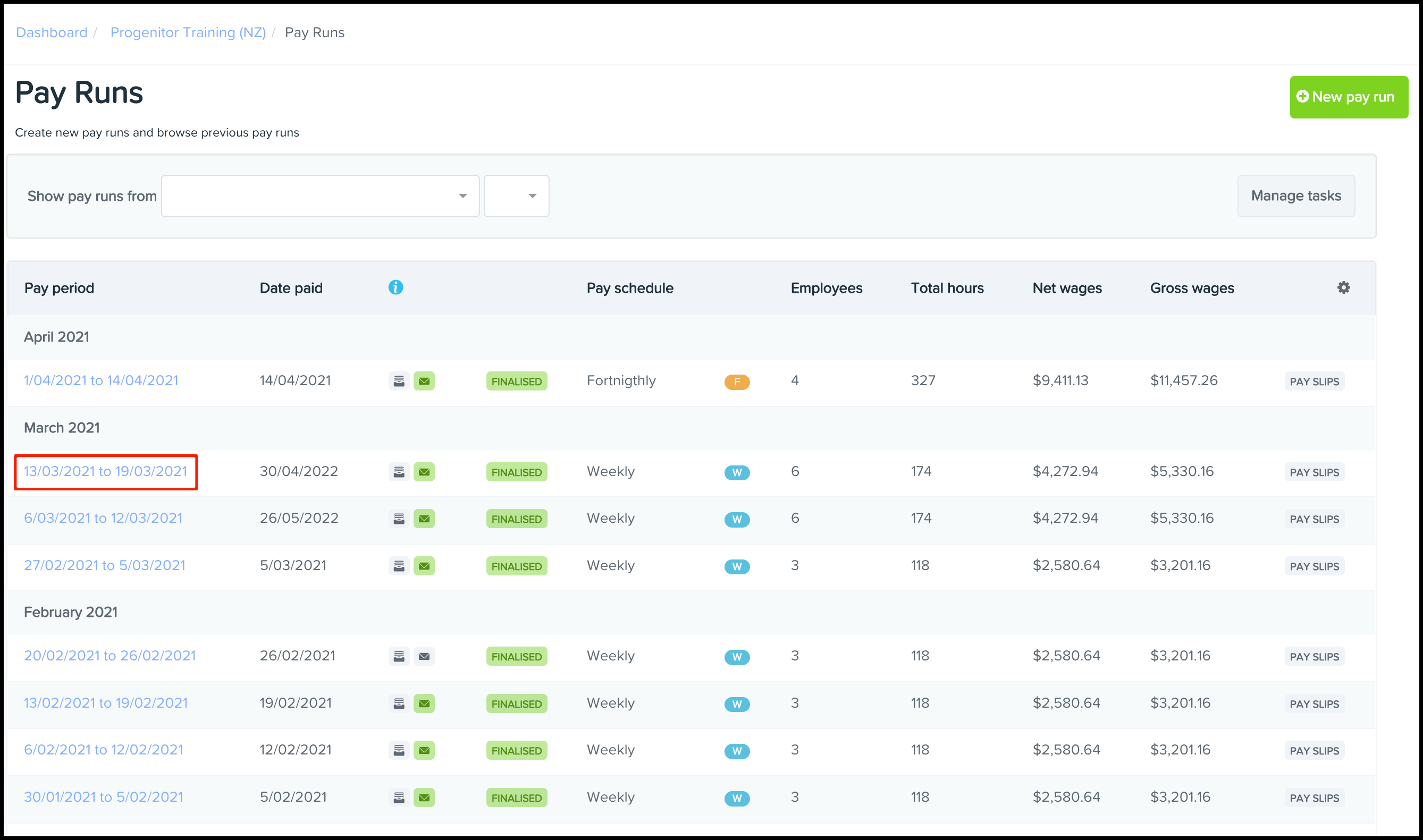- Click the finalised Pay Run that needs exporting to Xero.