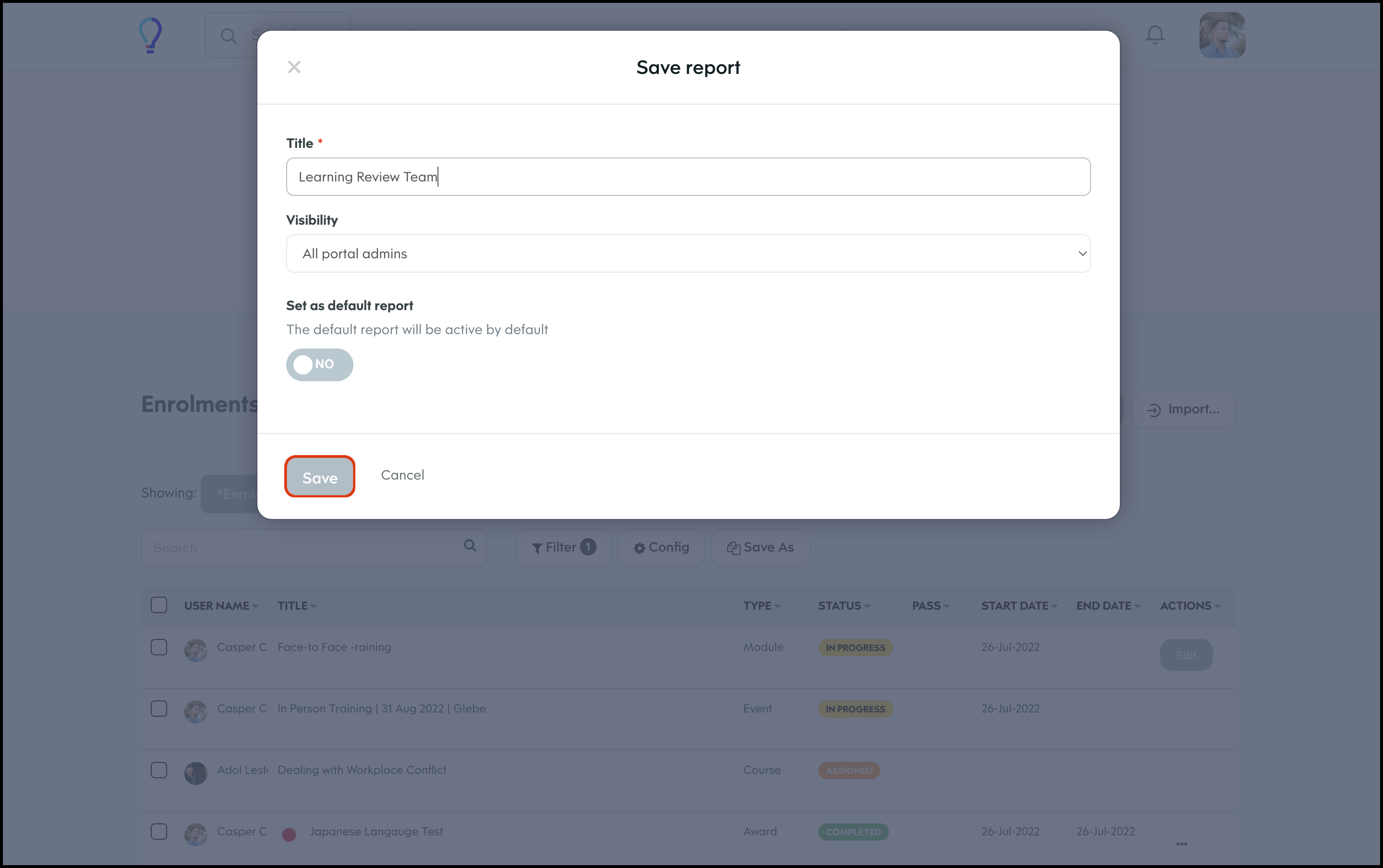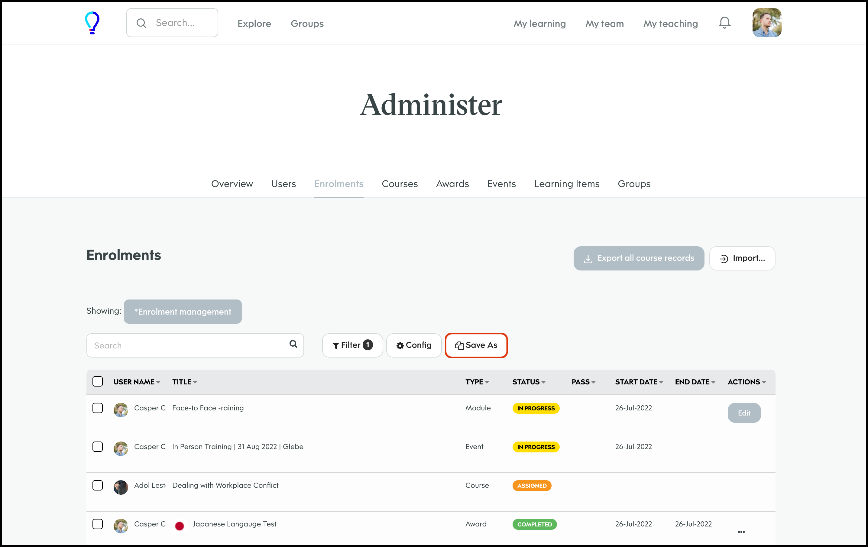 The Enrolment Management section lets you customise your report page by choosing to have the data shown in a table, calendar, or histogram. You can also customise what columns to include in each of these layouts and then save this view so you can access it again later. Finally, you can share this custom view with others on your learning platform, edit the information if it changes, and delete a record if it is no longer relevant.