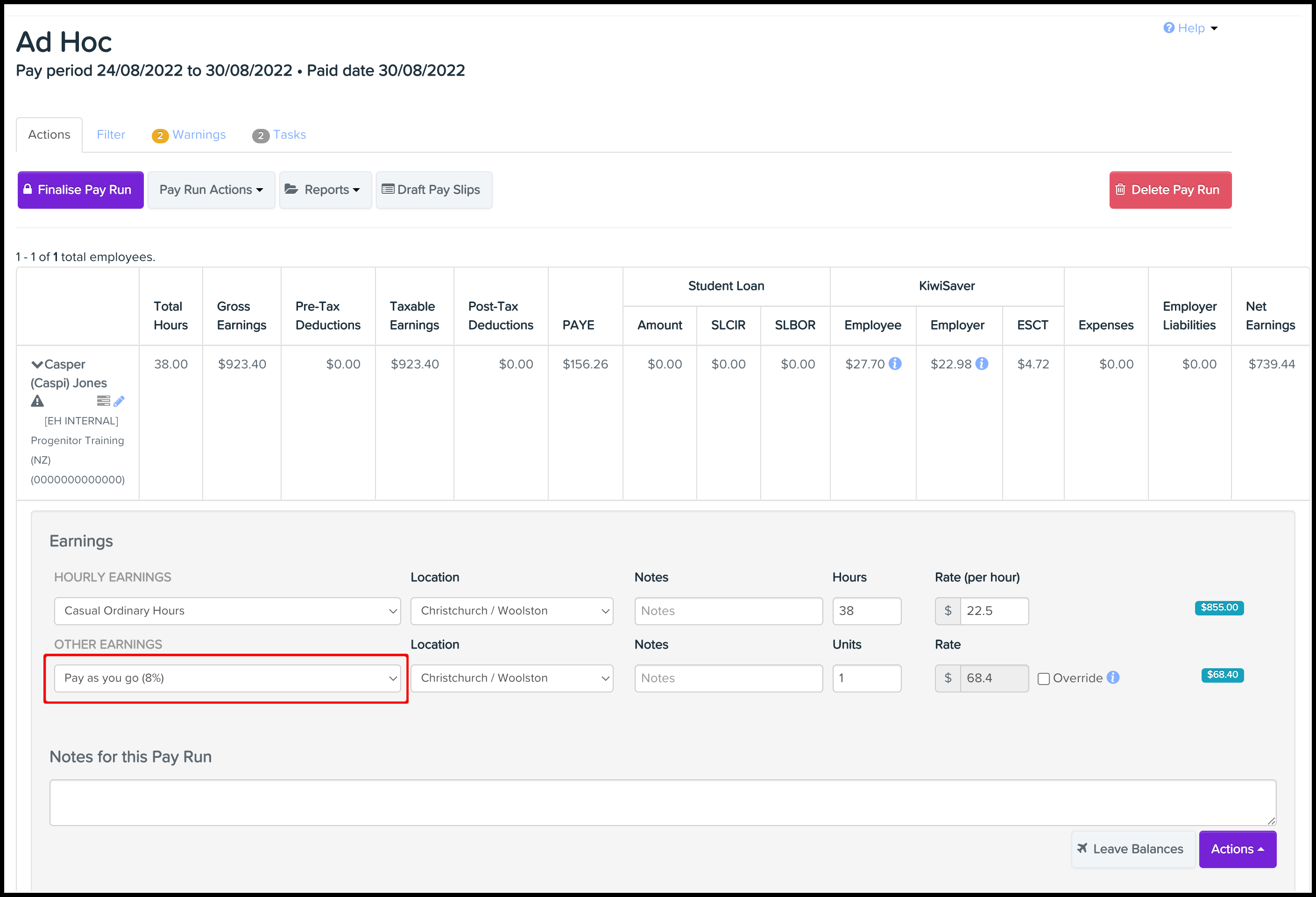 - In the pay run, the employee's pay as you go (8%) will be automatically included as an earnings line and will calculate the 8% of the employee's gross pay.