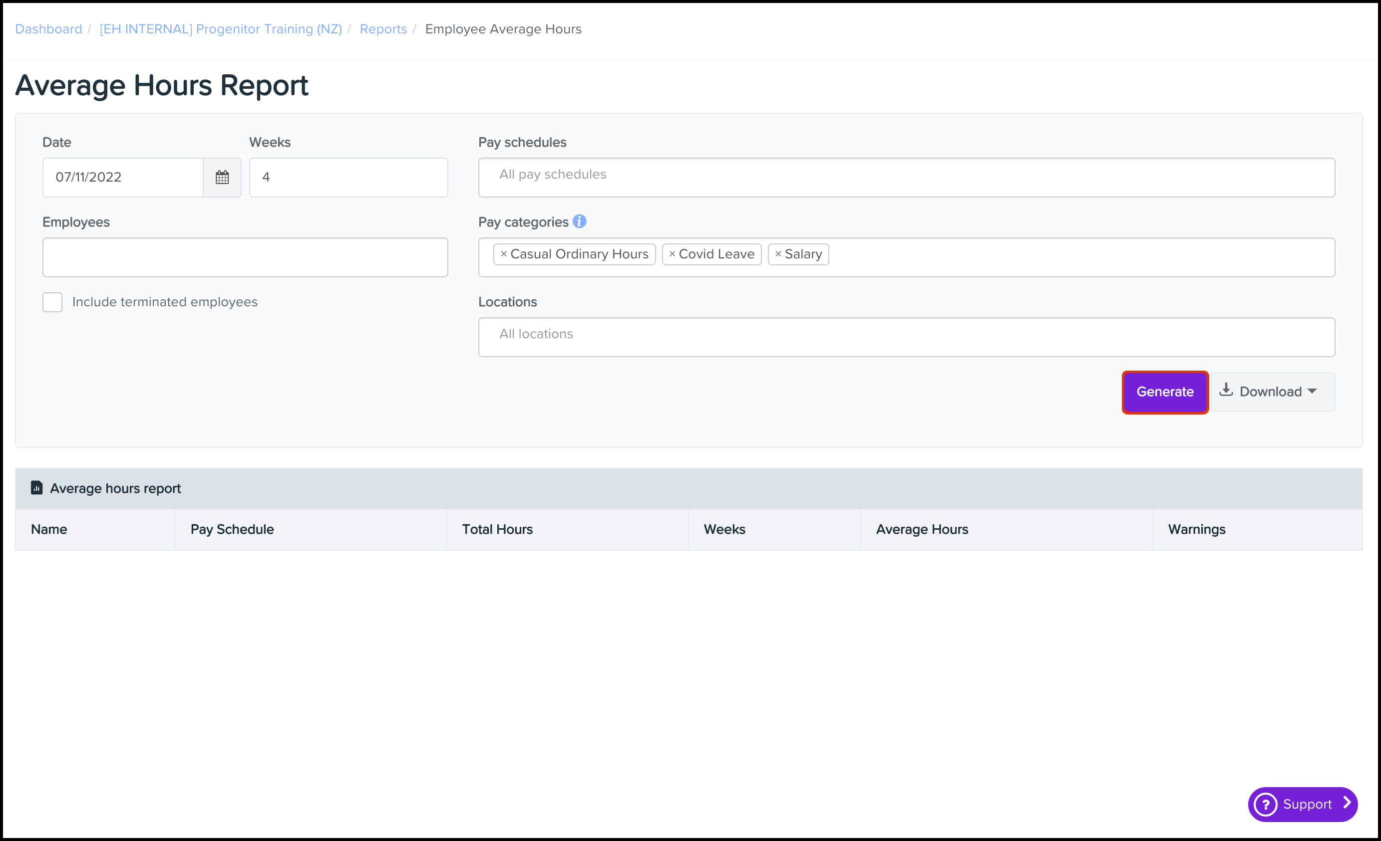 - Click the Employee Average Hours Report button.