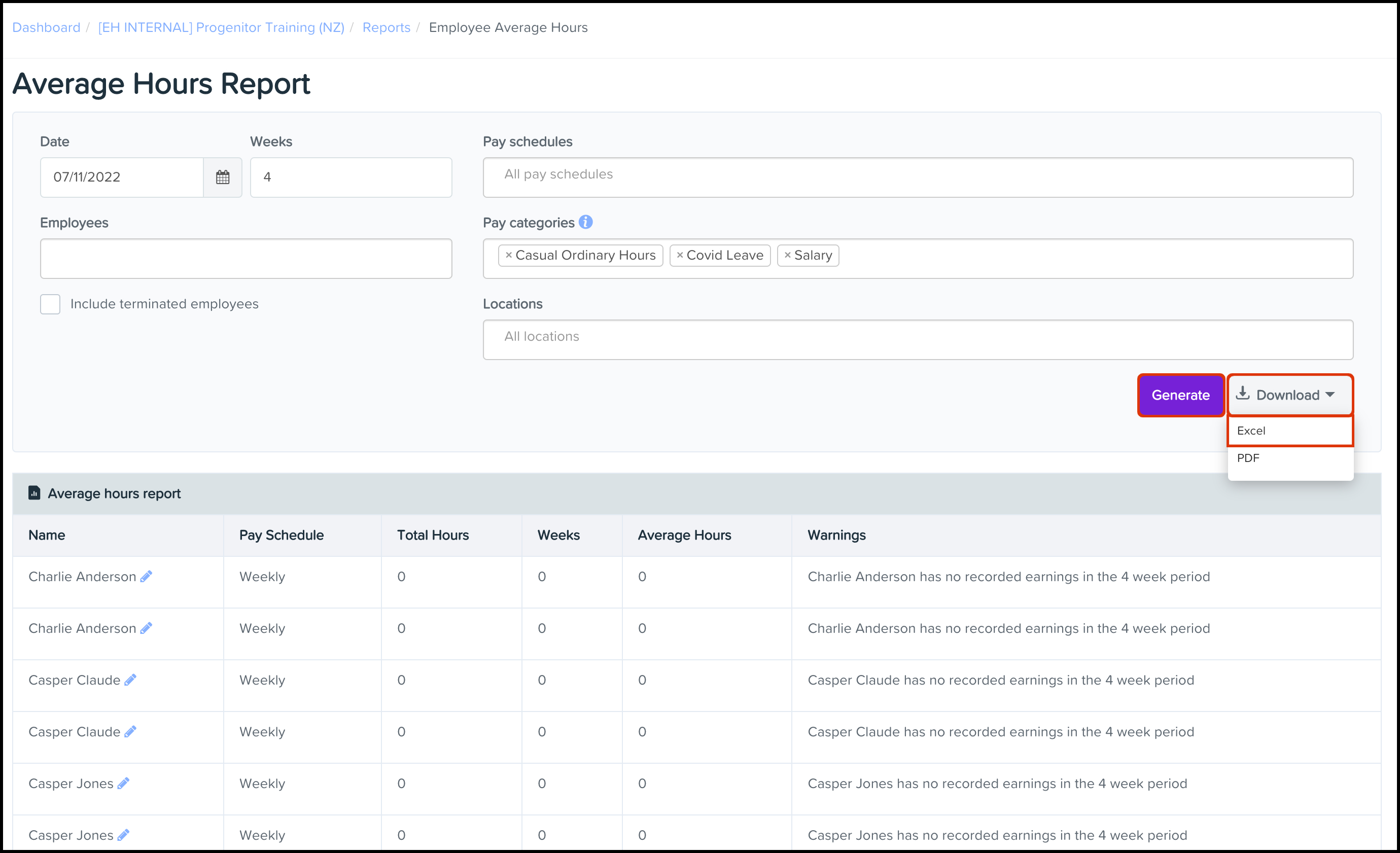 The Average Hours Work Reporting feature allows you to create a report showing how many hours on average your employees worked over a given number of weeks. You can also use this feature to download an excel file of this data, enabling you to load the report in Microsoft Excel. You can also select a PDF option if you need to provide users outside the payroll classic platform with the report.
