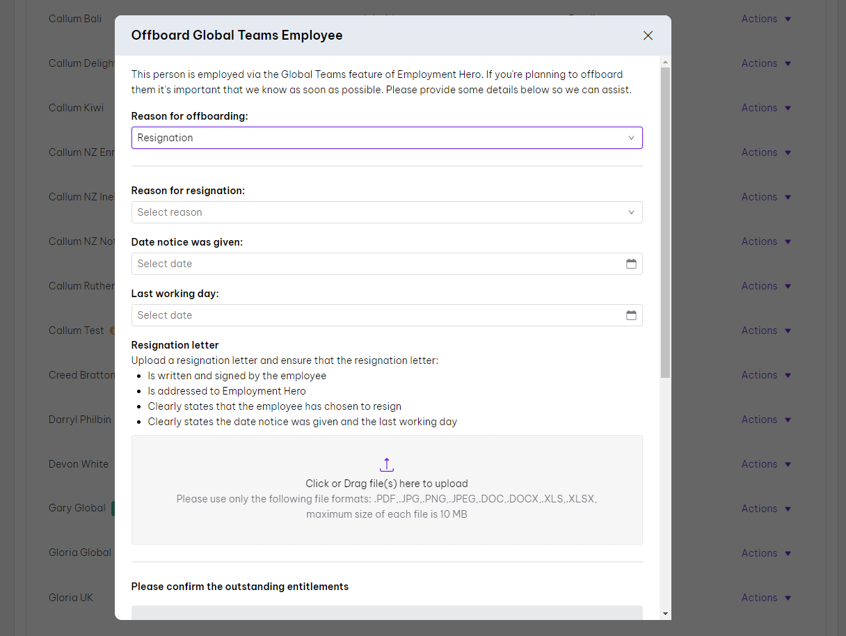 Global Teams employees are employed via Employment Hero. Therefore, unless the employee is resigning, you can not directly offboard an employee and must instead contact the Employment Hero team to begin this process.