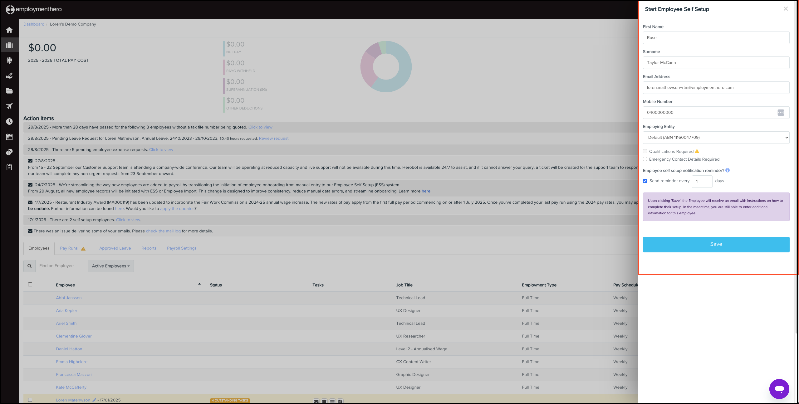 - Complete the fields in the Start Employee Self Setup popup then click Save.