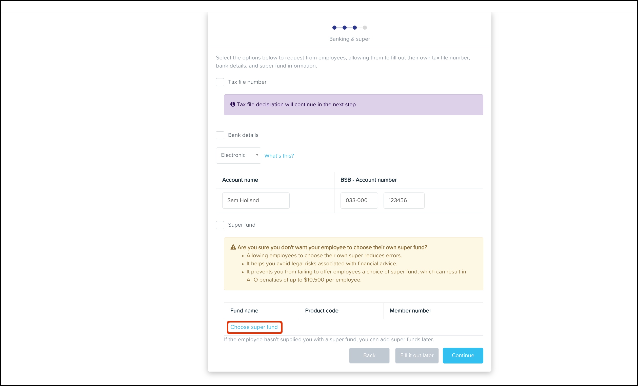 - If you unticked the Super fund checkbox, click the Choose super fund button.