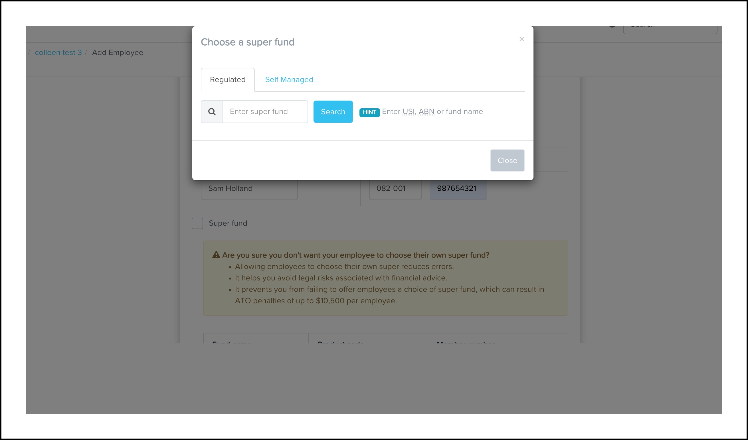 Stay on the Regulated tab, type in the super fund, and click Search. Then select the correct fund from the results and click OK. (Do this if the employee is with a regulated super fund.)