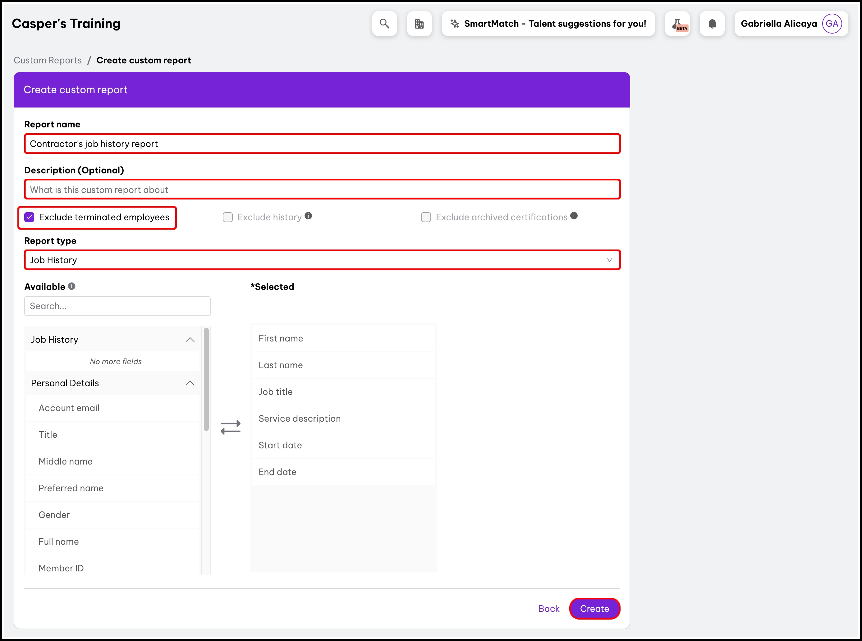 You can use the Custom Report feature to build a contractors' job history report to display your contractors' start and end dates.