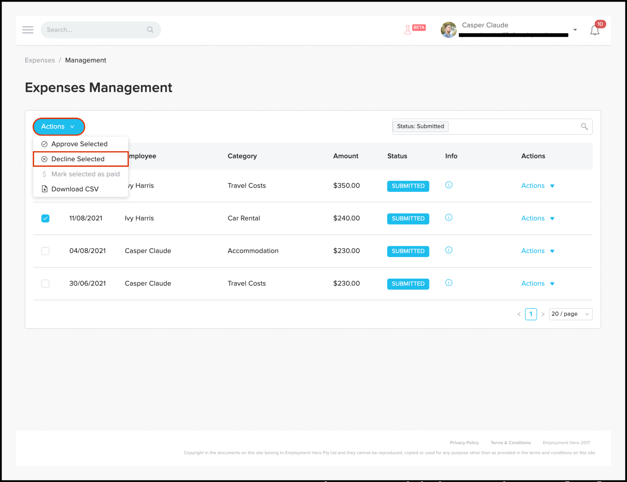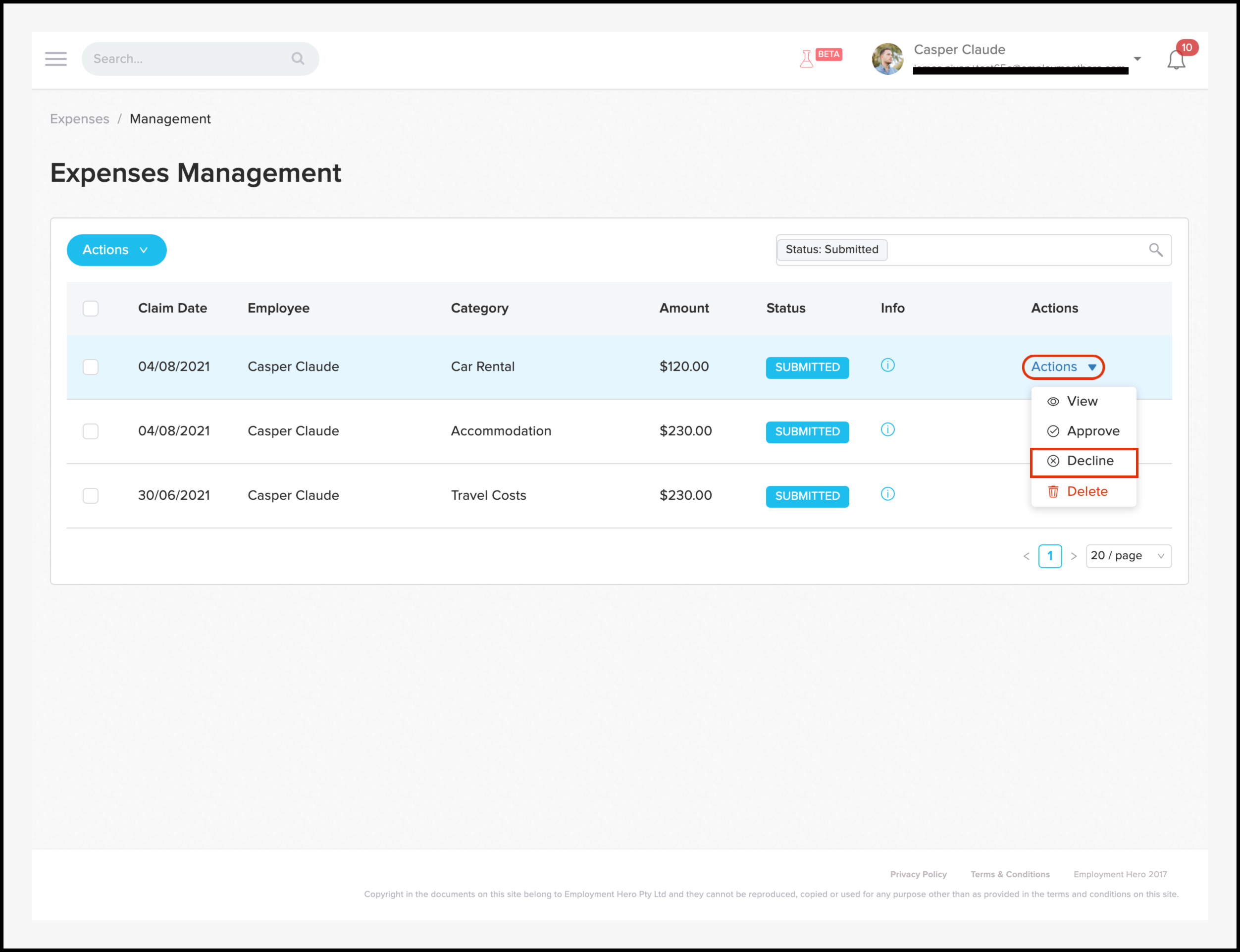 As a manager of a Global Teams employee, how do I decline their expense claims in-platform?