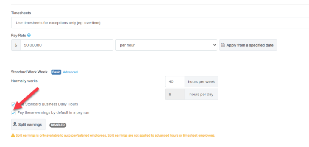 - Untick "Pay these earnings by default in a pay run" for their standard salary or hourly rate.