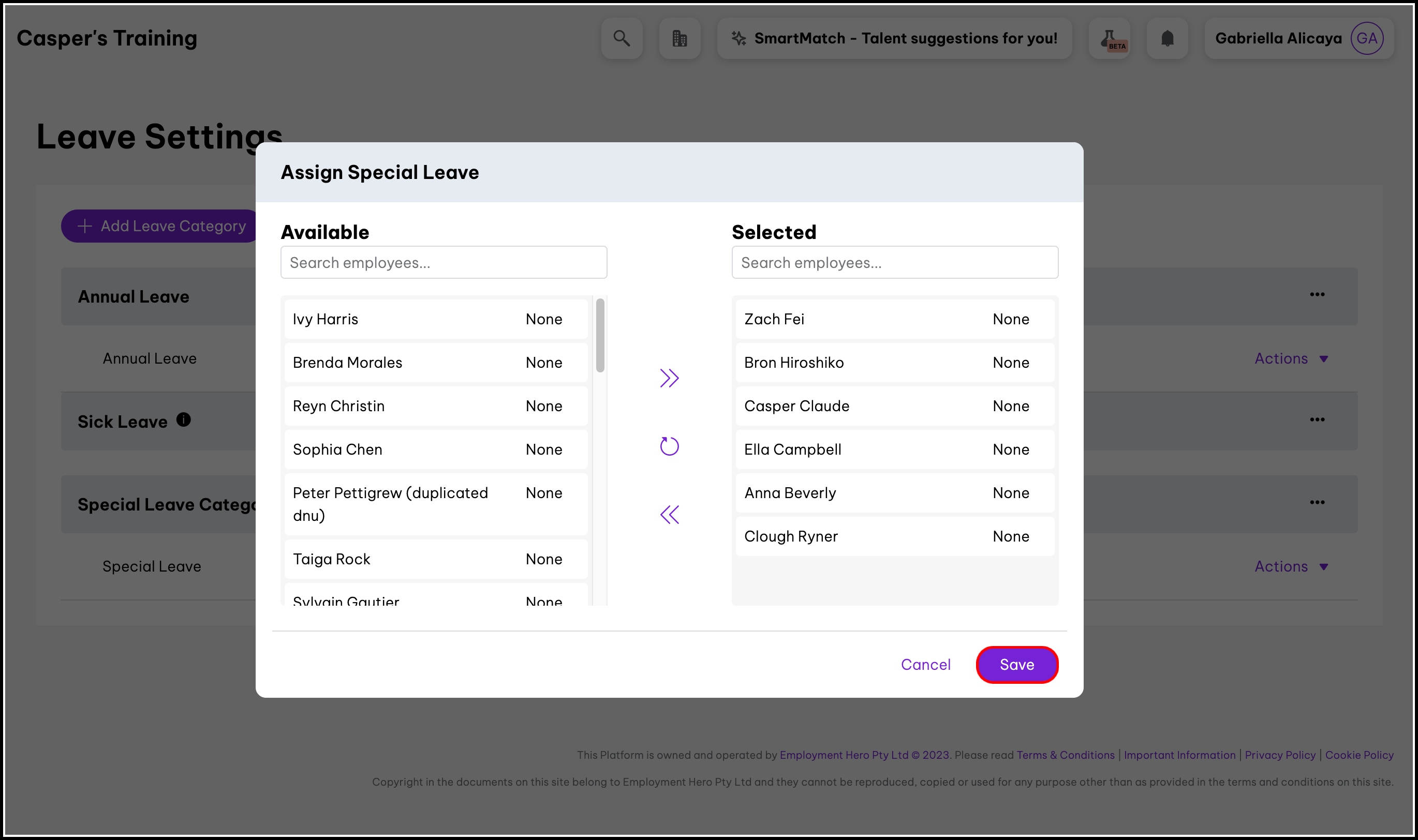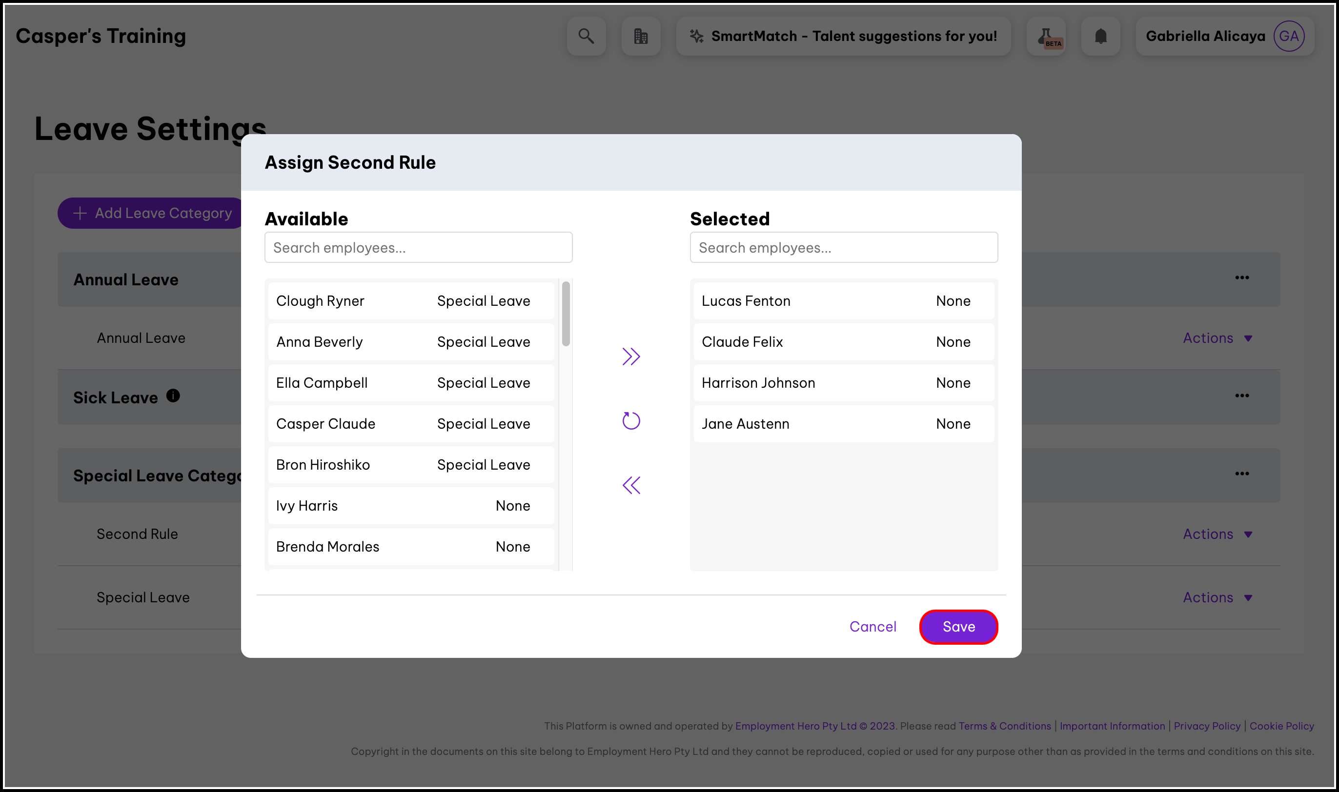 - To assign the rule to certain employees, drag their name from the Available column to the Selected column.