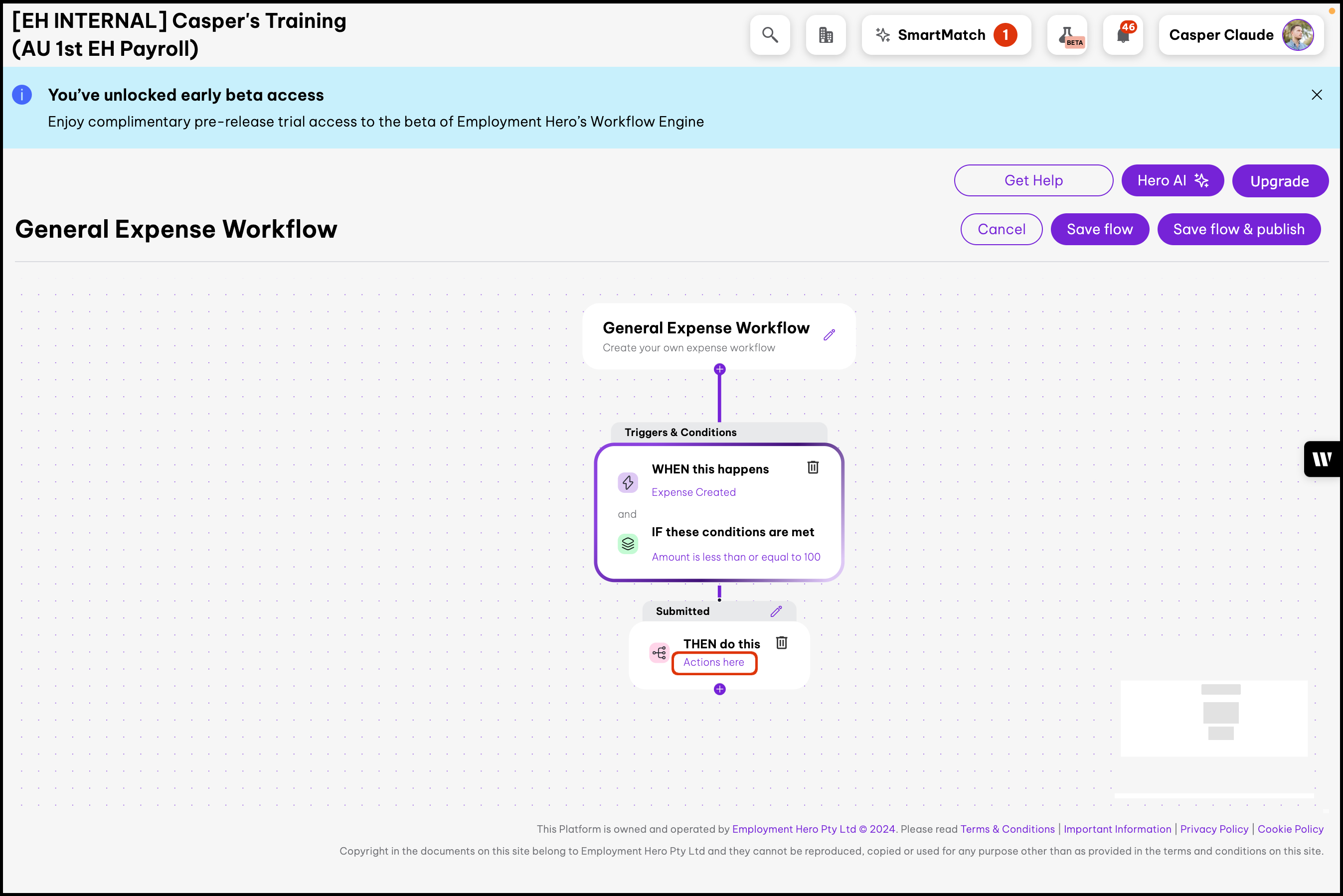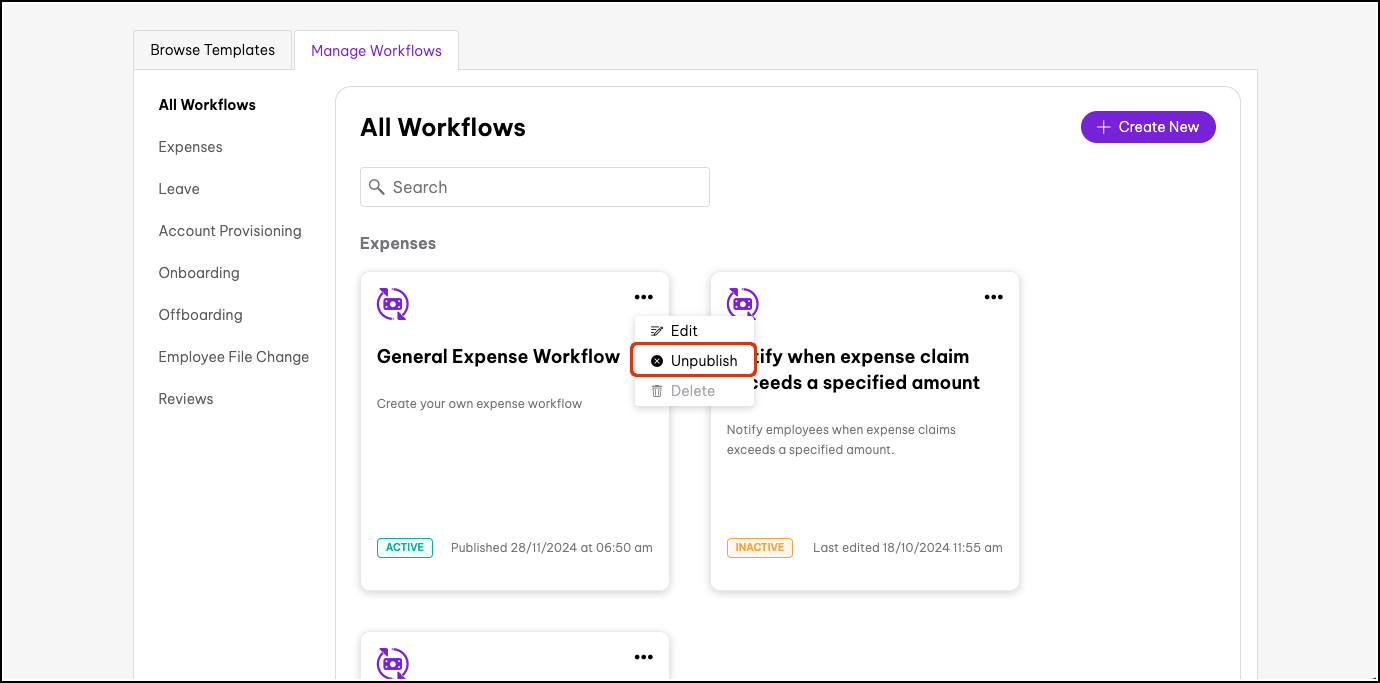 This feature allows you to customise expense approvals to suit your organisation's needs. By unpublishing the default workflow, you can then create your own expense workflow that aligns with your approval hierarchies.