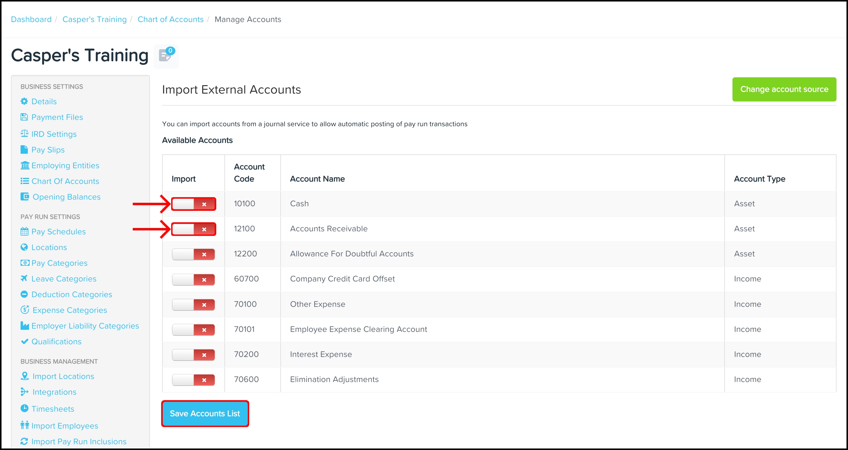 - Click on the toggle button to enable the accounts you would like to use.