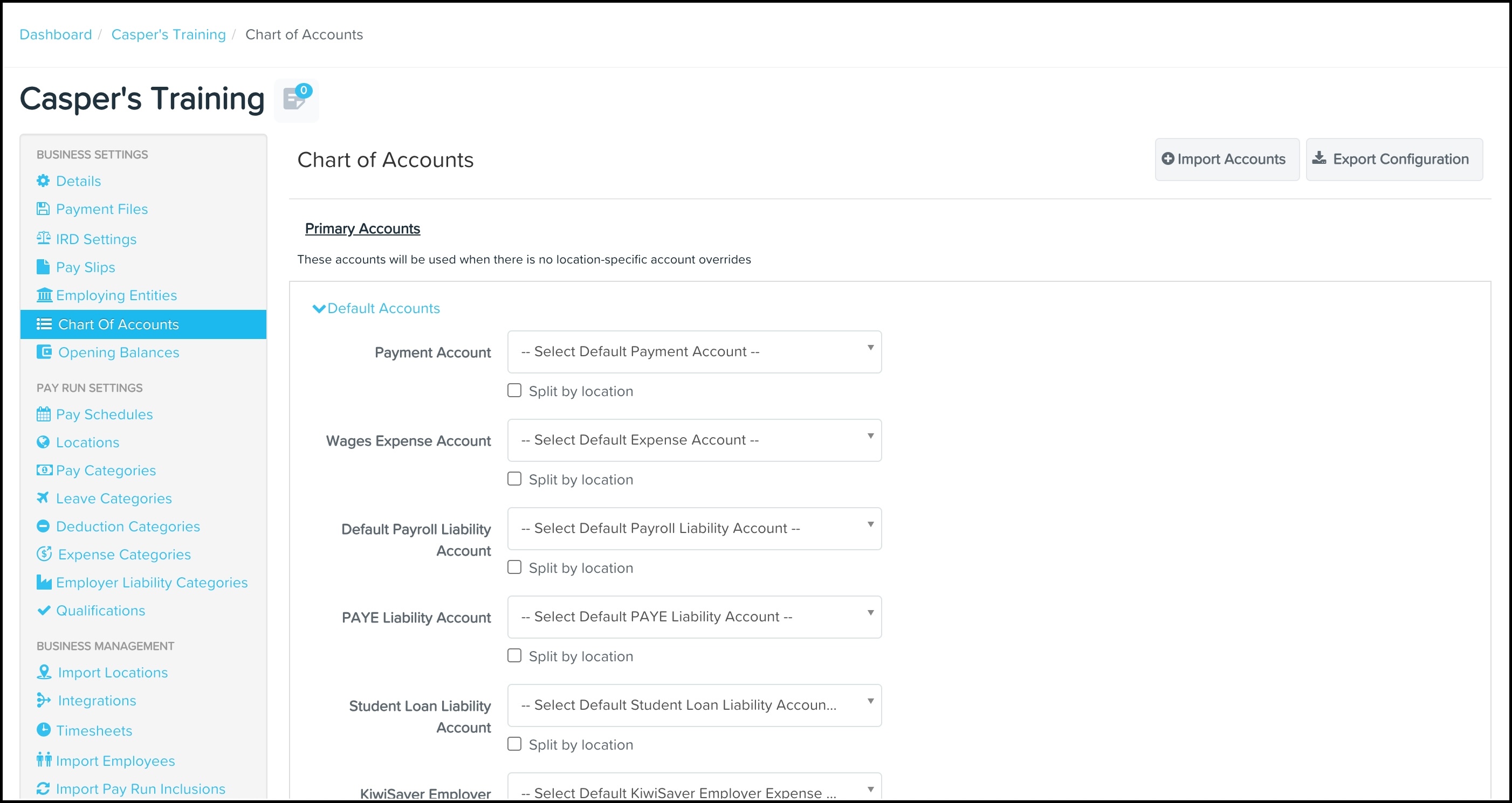 Once you have configured your pay run option, the next step is to set up your chart of accounts by going to the payroll settings tab on the payroll dashboard, click on 'Chart of accounts' under the business settings heading.
