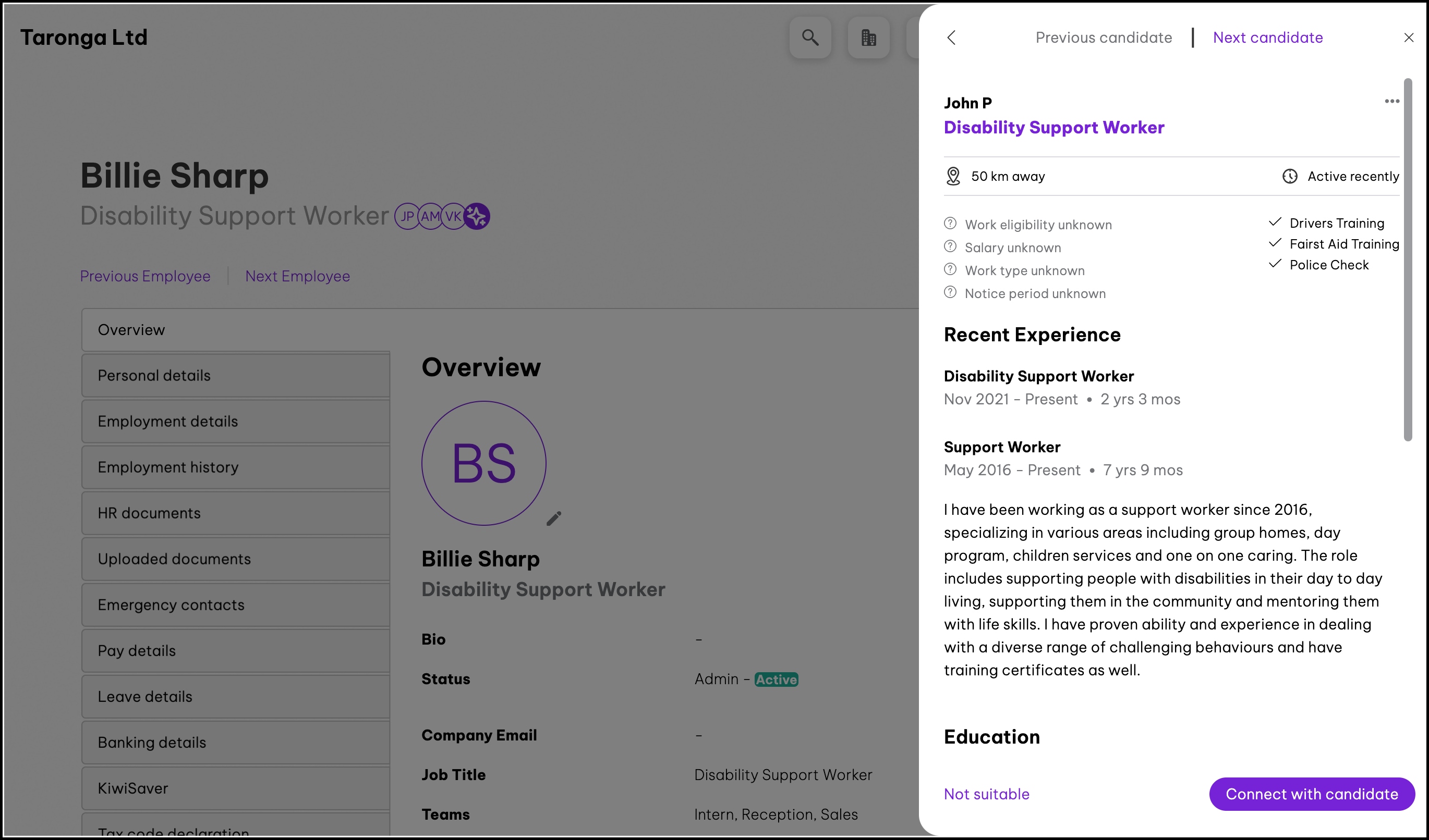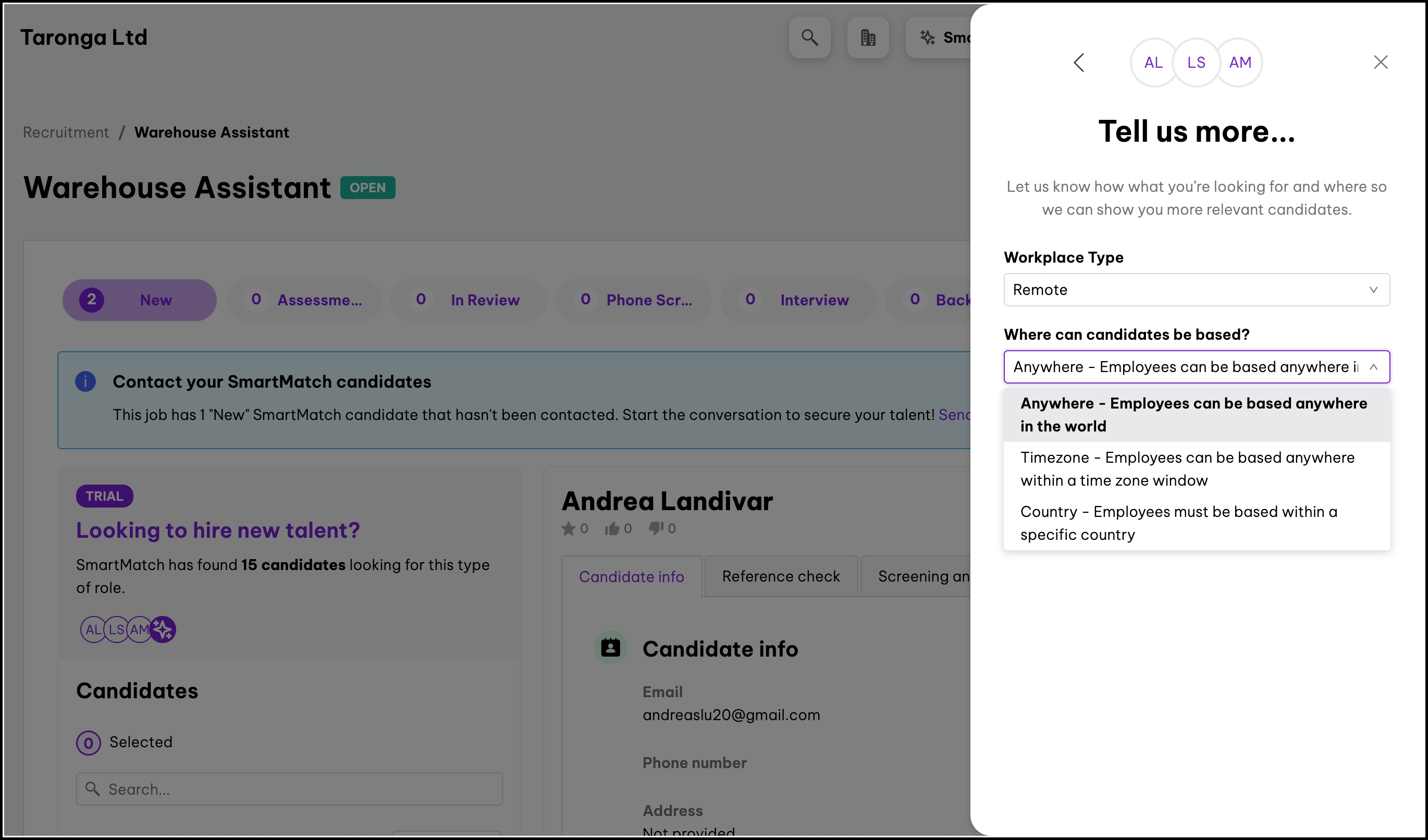 We have SmartMatch enabled by default in the Recruitment module for admins and owners, and hiring managers with access. In addition, SmartMatch can be used in the employee file and active job listings in the Recruitment module. You can refer to the following articles to see how to use SmartMatch on other areas on the platform:
