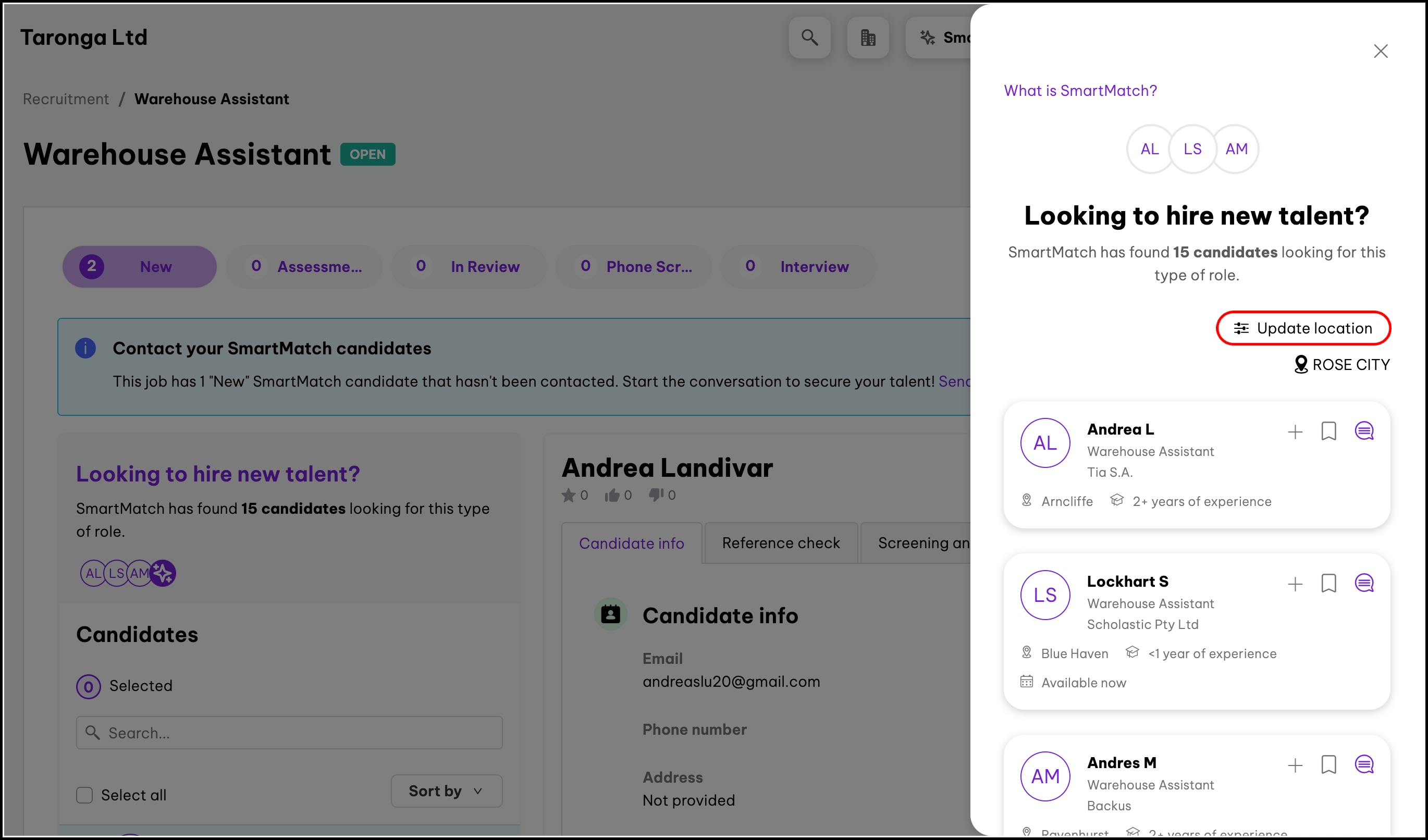 The Update location button is on the SmartMatch panel that appears when you click the Talent Recommendations button in the following places: