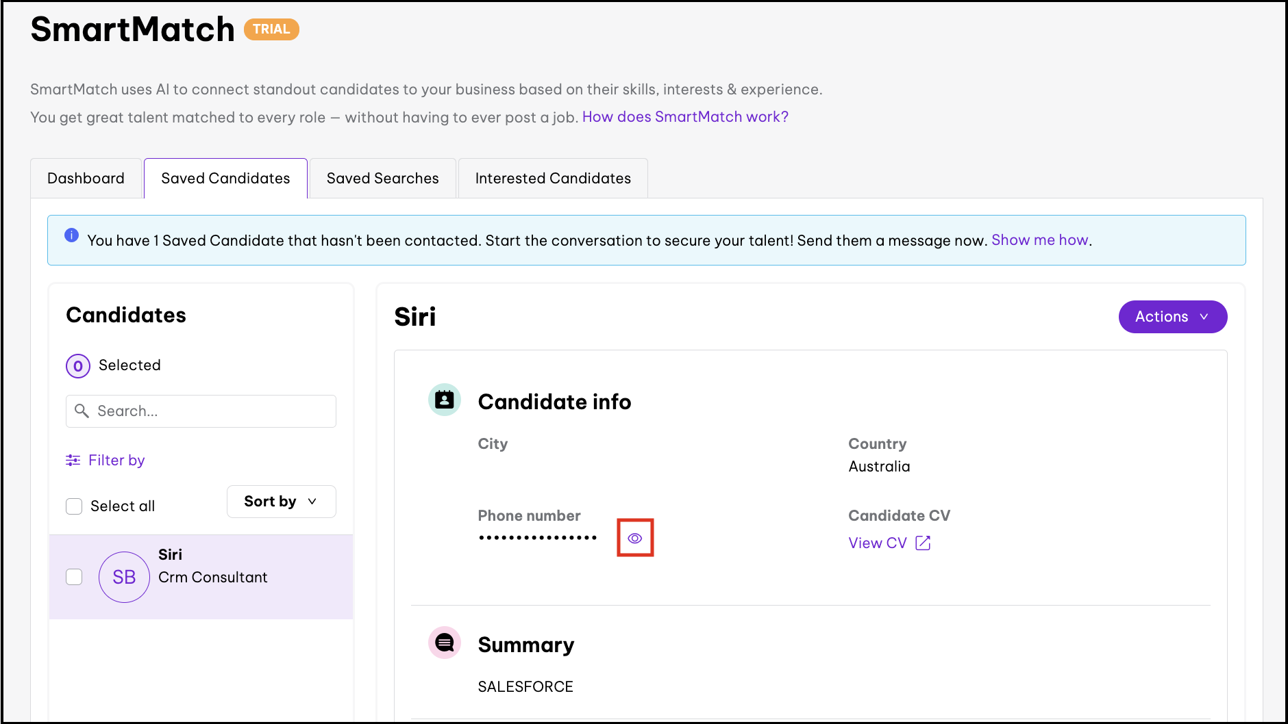- Manage my saved SmartMatch candidatesThis feature lets you view, save, connect with, message, shortlist, and delete your saved SmartMatch candidates.