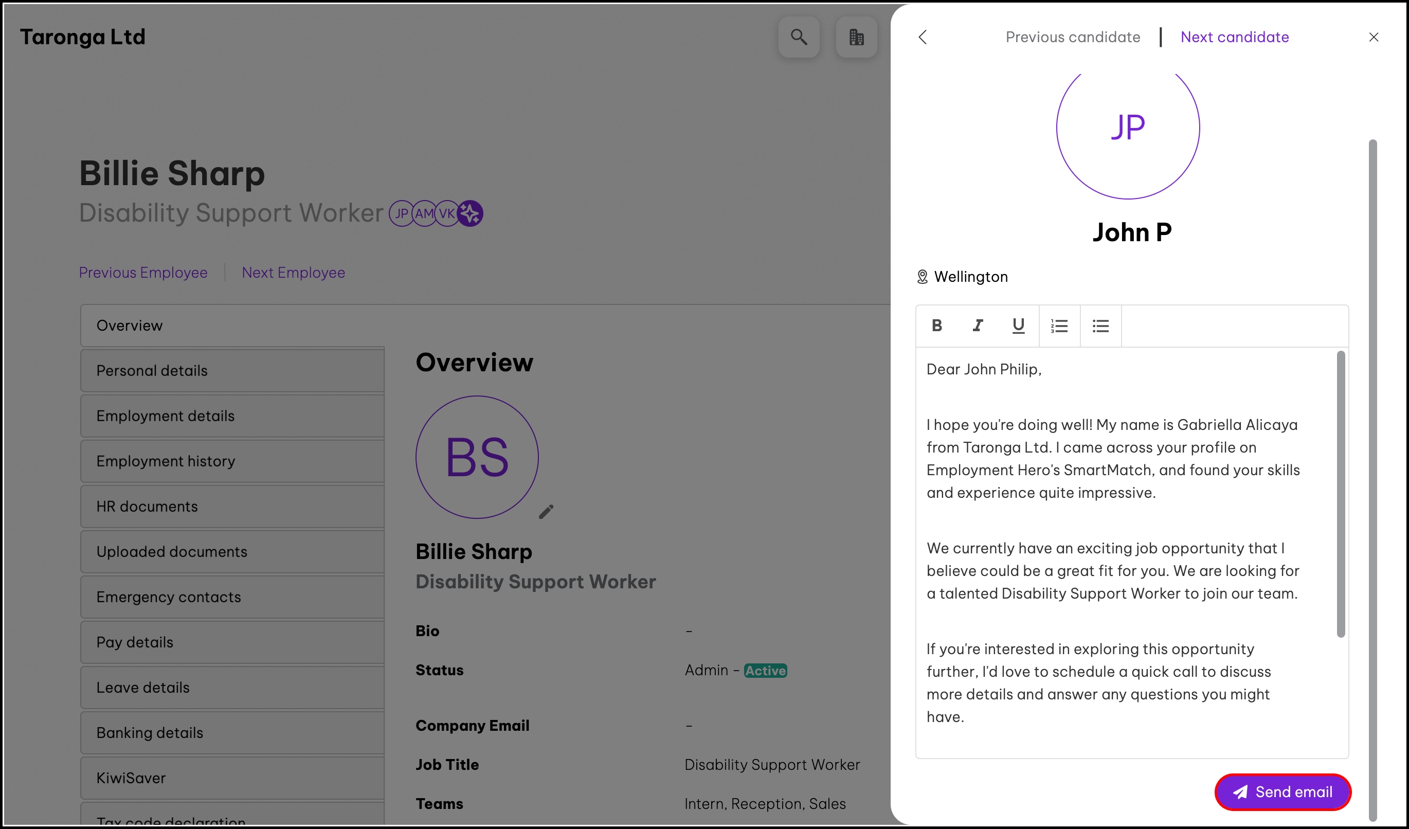 We have prepared a template for you, but you can edit the message so it suits your organisation best. You can also email the candidate by clicking the Connect with candidate button when you view their profile.