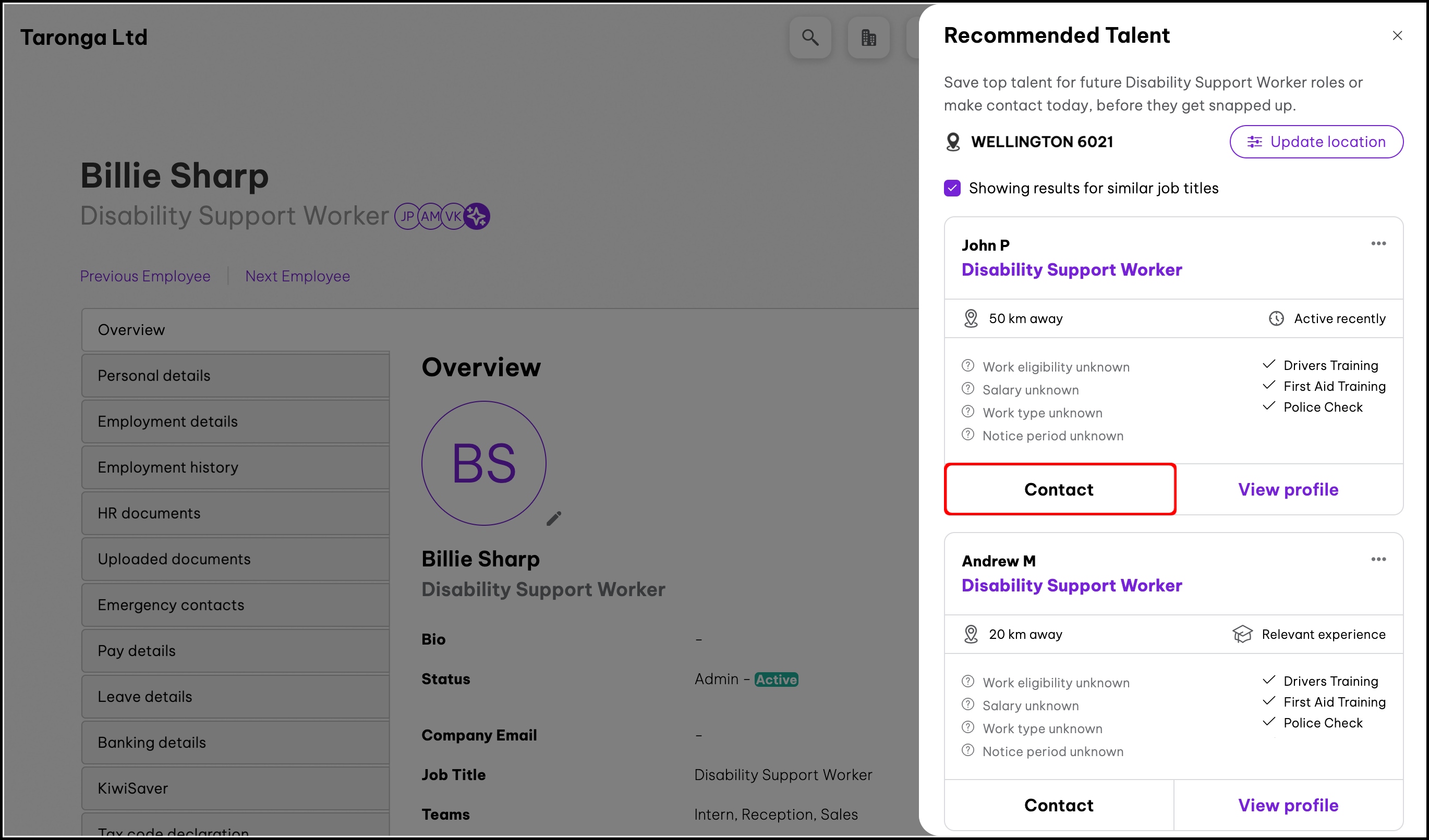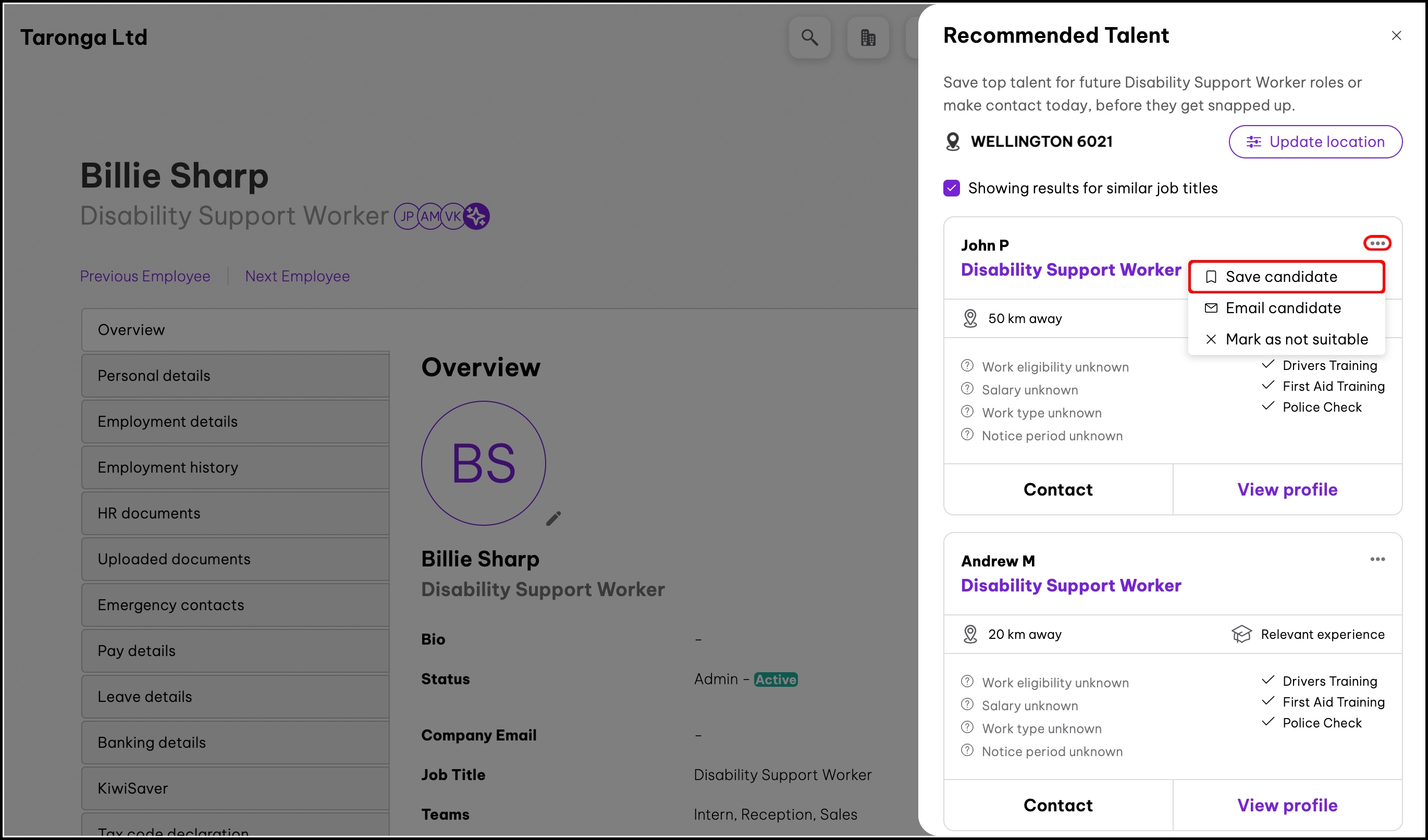 The employee file screen allows you to view details about your employees and their roles. You can use SmartMatch to find suitable candidates for specific roles, such as a product engineer. From the employee file, you can view, save, email, and mark potential candidates as unsuitable for the role. For People Managers and Hiring Managers, please refer to this article to learn more about your user access.