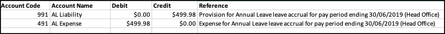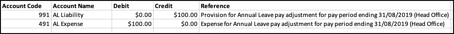 The corresponding journal transaction lines for the accrued annual leave provisions will appear as follows: