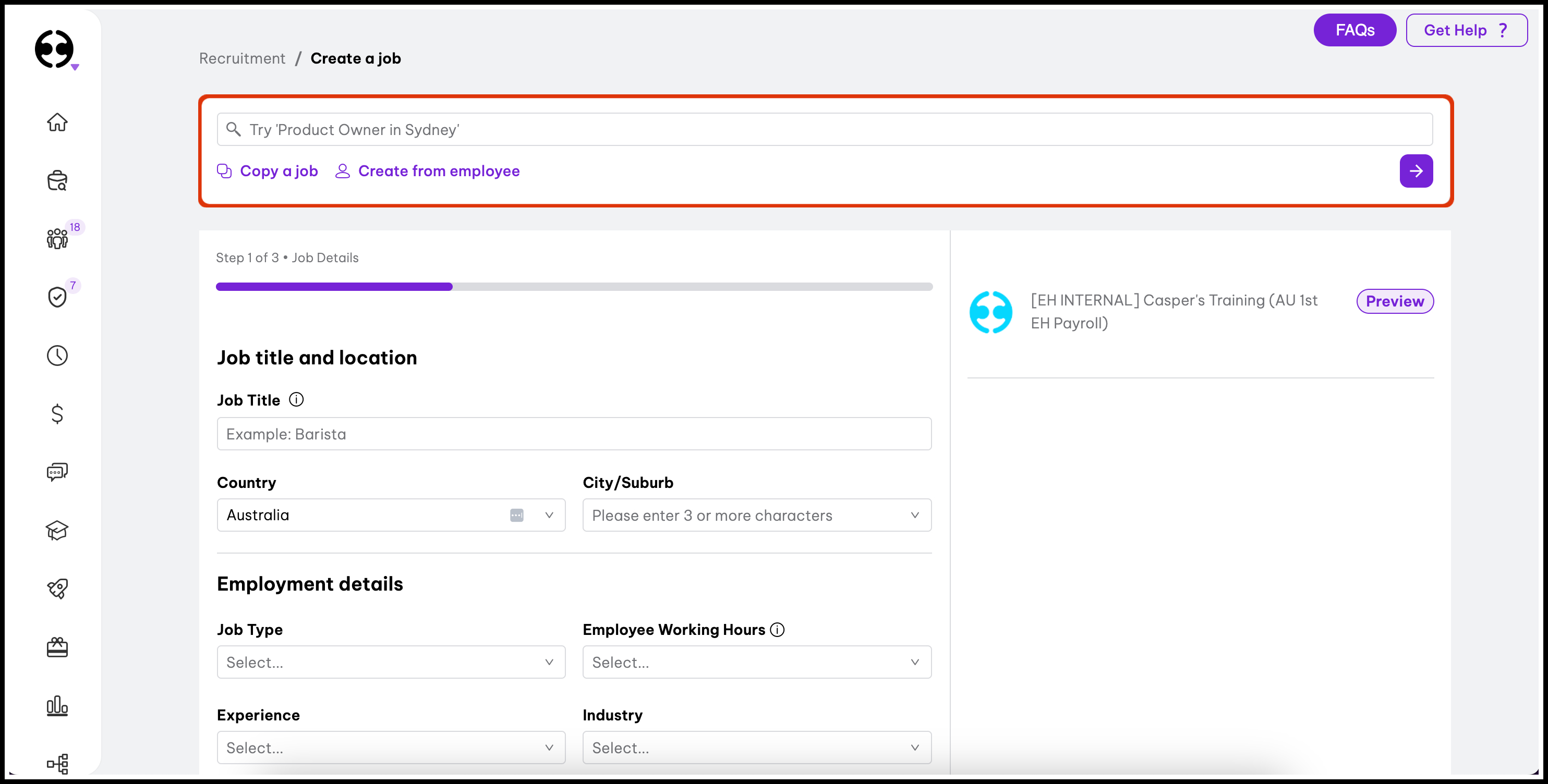 - Multiple creation methods - Start with quick search, copy an existing job, or create from an employee profile