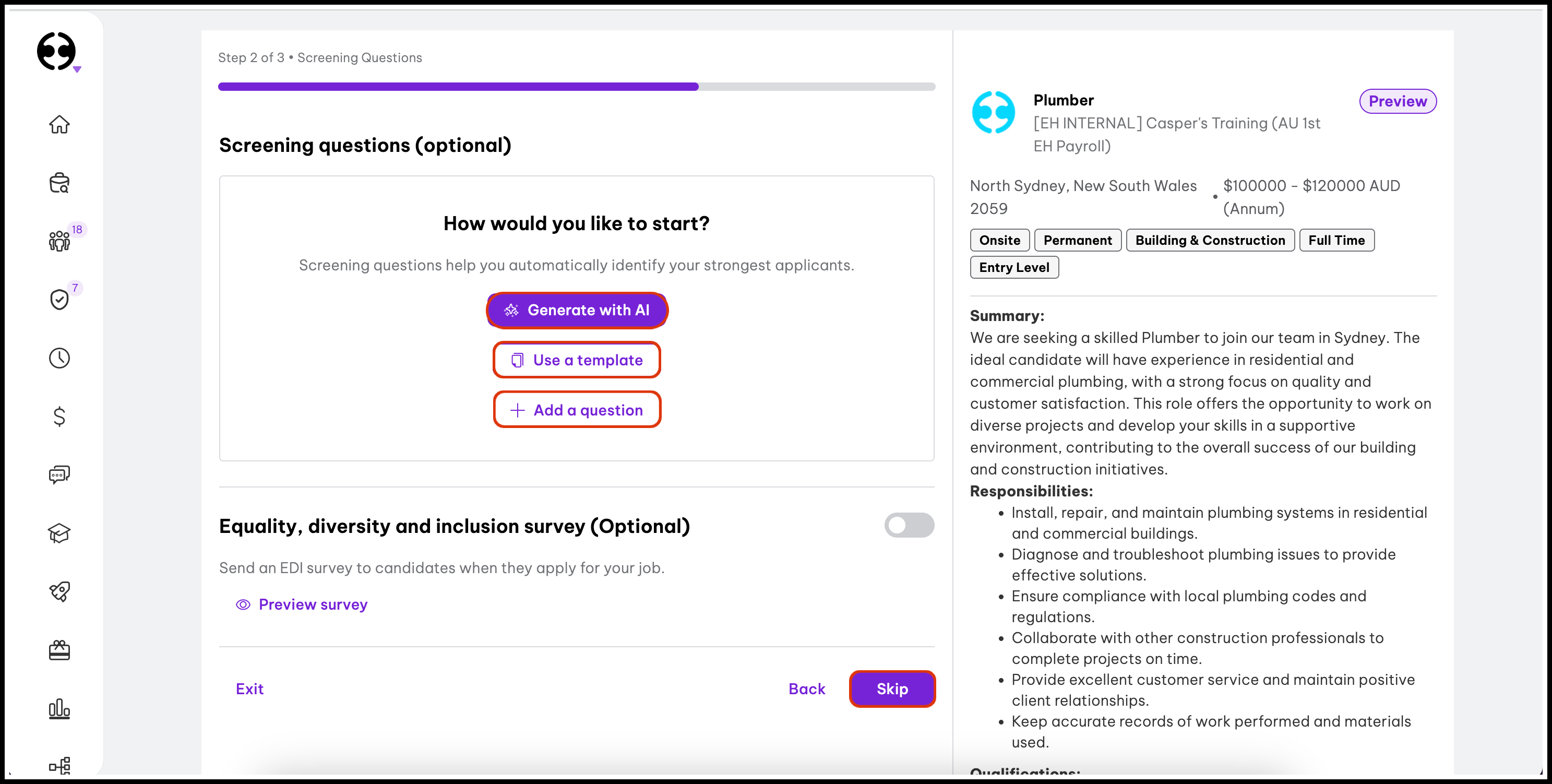 - Optional: Add an EDI survey - You can also add an Equality, Diversity and Inclusion (EDI) survey by toggling it on. This optional survey will be sent to candidates when they apply and helps you gather diversity information.