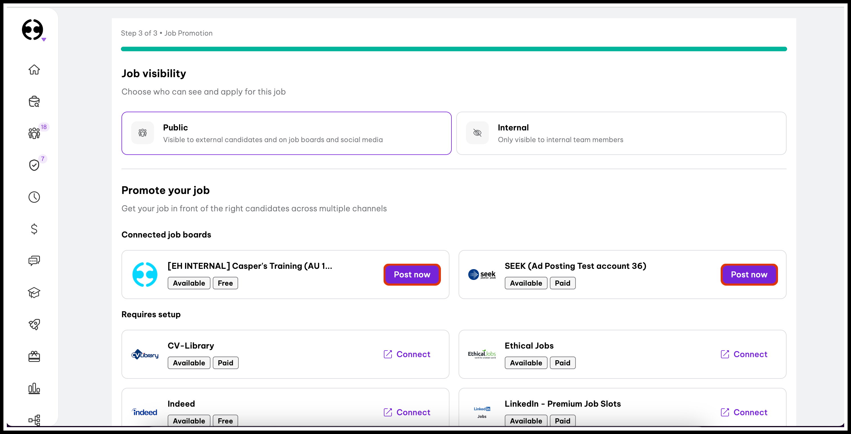 This final step allows you to choose who can see and apply for your job, and which job boards you want to post it to.